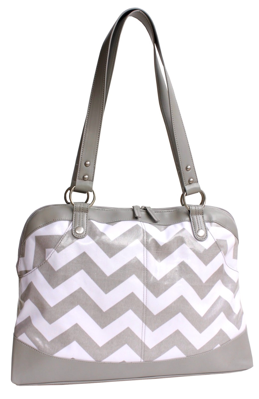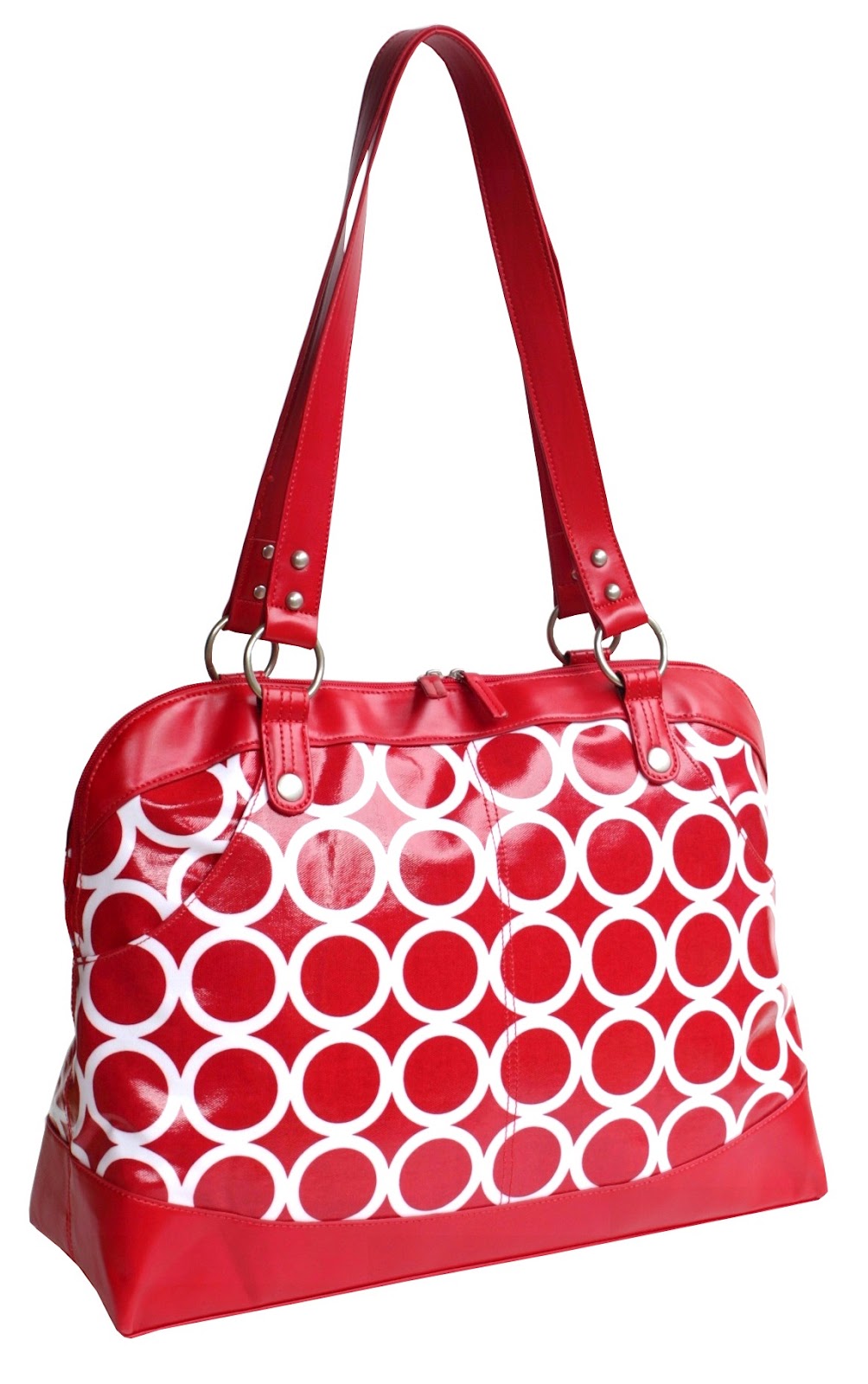 I finally got my new bag designs in, photographed, and on my website! Yay! I think that they are amazing and can’t wait for all of you to see them. There are two new laptop satchel prints that are both in a laminated cotton canvas with faux leather trim, the Red Circles and Gray Chevron, and they will retail for $89.99 each.