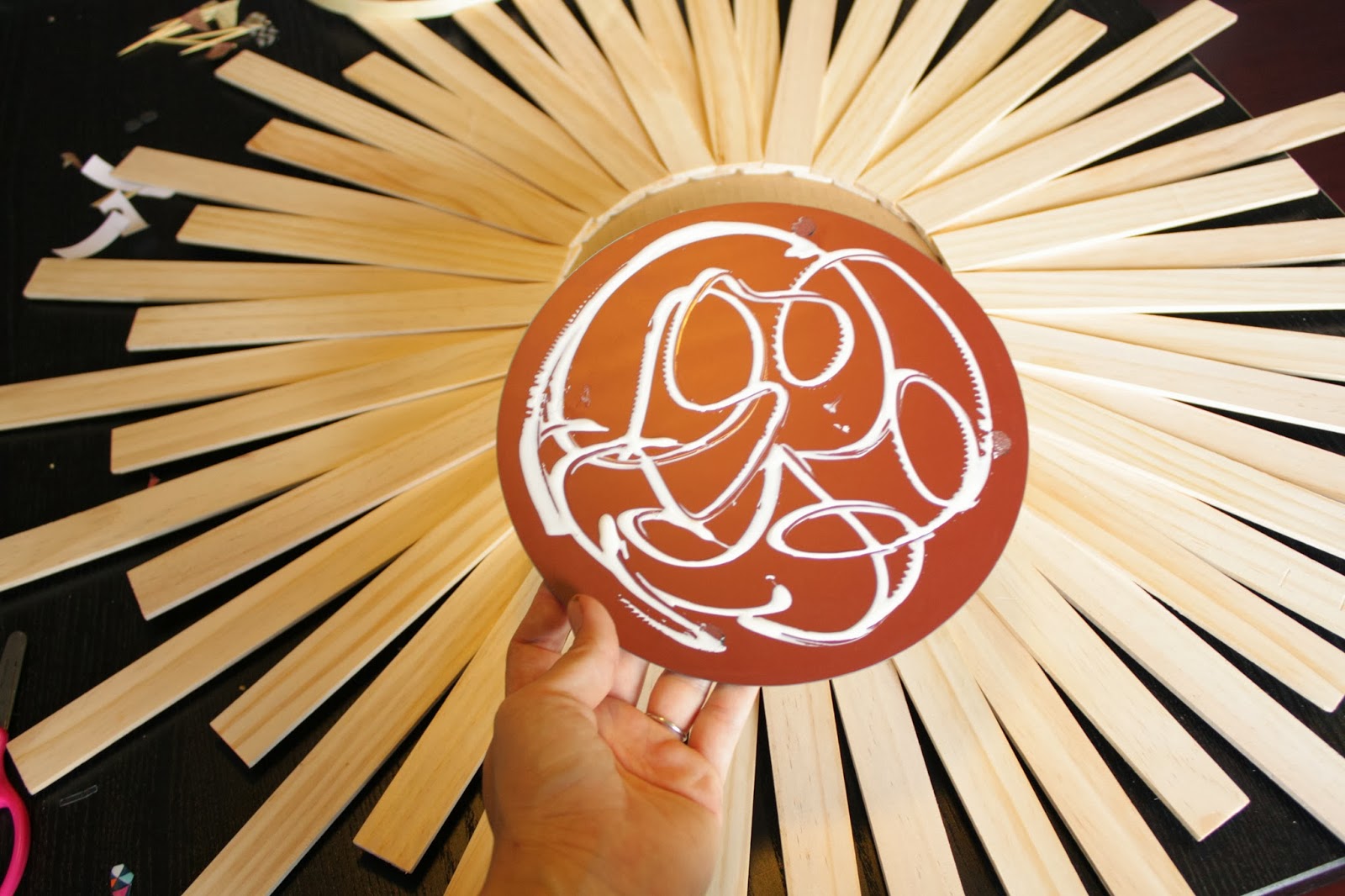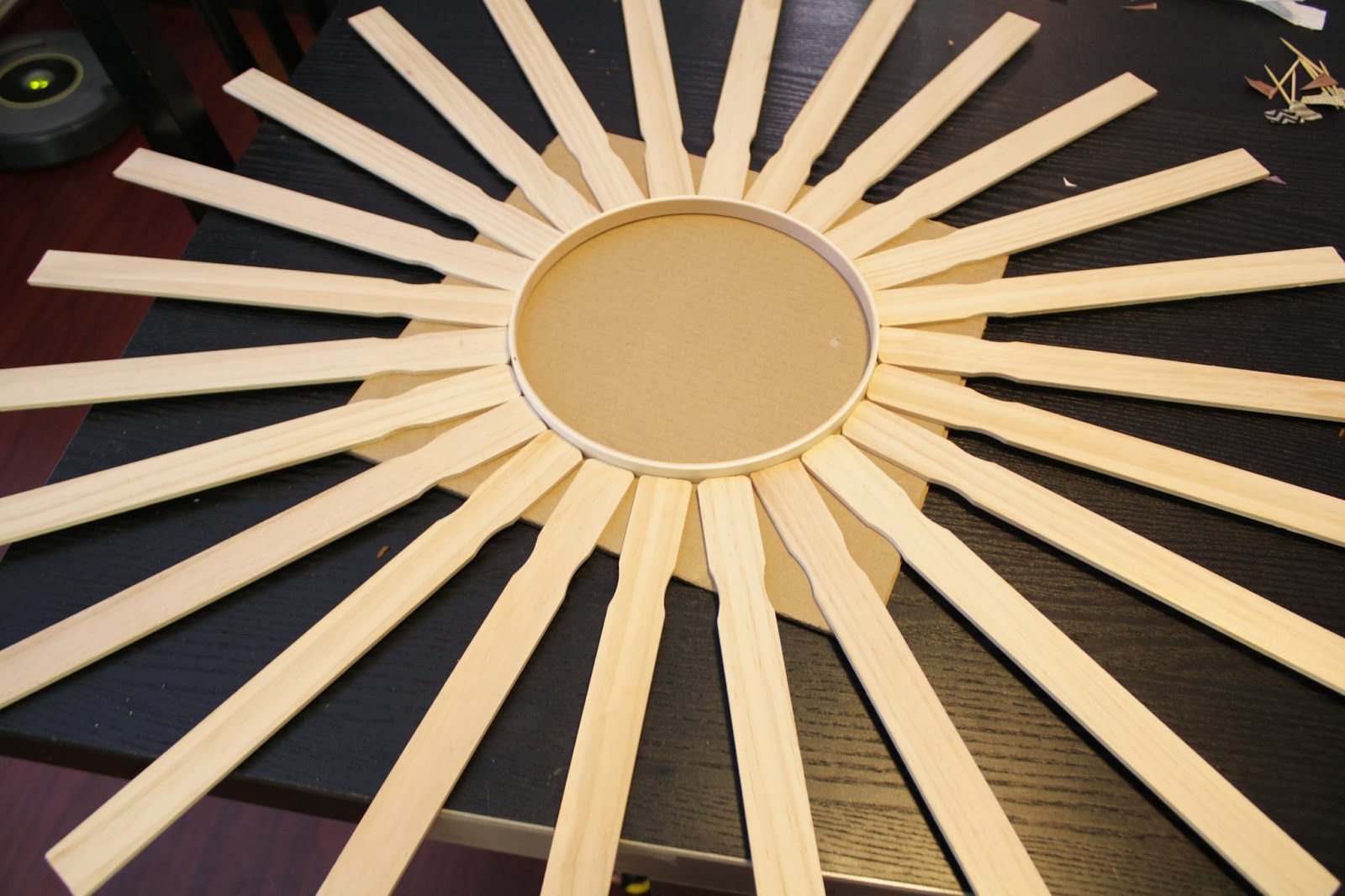 To begin, trace a circle on the center of the cardboard and glue the paint stir sticks with the indented portion facing the center. Do this around the entire circle.