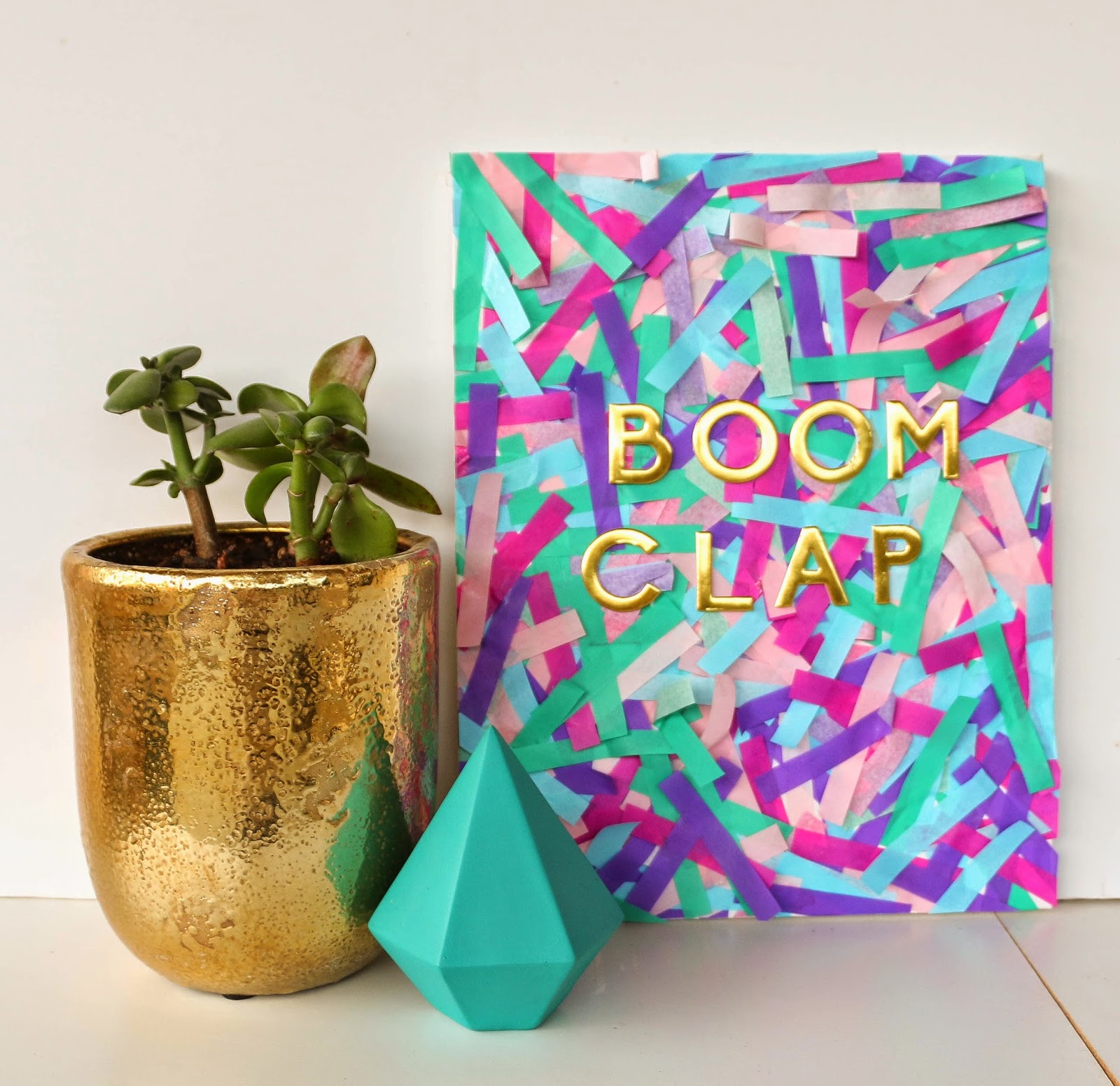 Once dry, cut the edges of the tissue off to ensure a clean, crisp edge and adhere your stickers in the phrase of your choice (we choose the lyrics to one of Madeline’s favorite songs). Then display promptly and gaze lovingly at your fun tissue paper party art. And don’t forget to check back tomorrow to see the gallery wall that this bad boy ended up on!