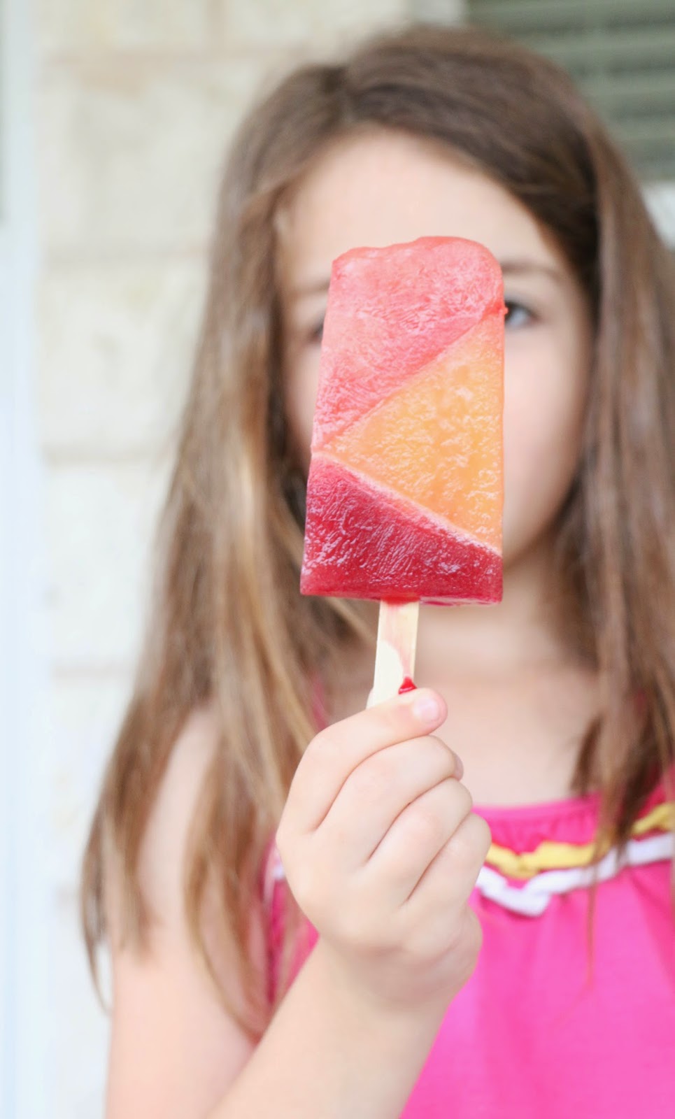 So far this week we have seen Madeline’s bathroom and bedroom, made fun tissue paper art, and decorated a plain Ikea dresser with pink glitter chevrons. Today however, I am going to show you a twist on one of Madeline’s favorite things. The popsicle. That girl loves her some popsicles. You may remember the Easter egg popsicles I made for her when she was little. Well, today I am going to show you how to make super cute colorblocked pops. These would be great for a party, after school snack, or really just about any time since they are just juice.