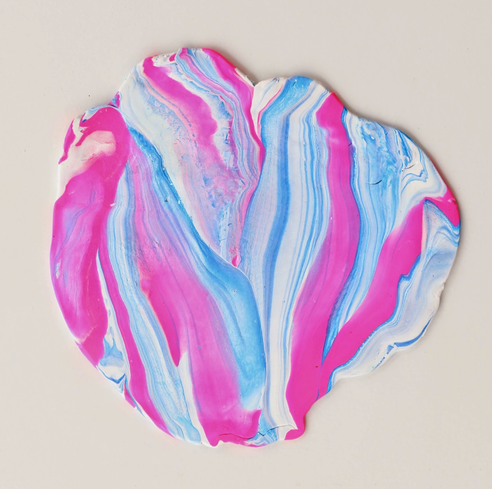 Next, twist your clay rolls together and roll out again into a new log. Then continue to twist and roll until you start to get a nice marble pattern. Now you will need to form the clay into a ball and roll it out with a rolling pin.