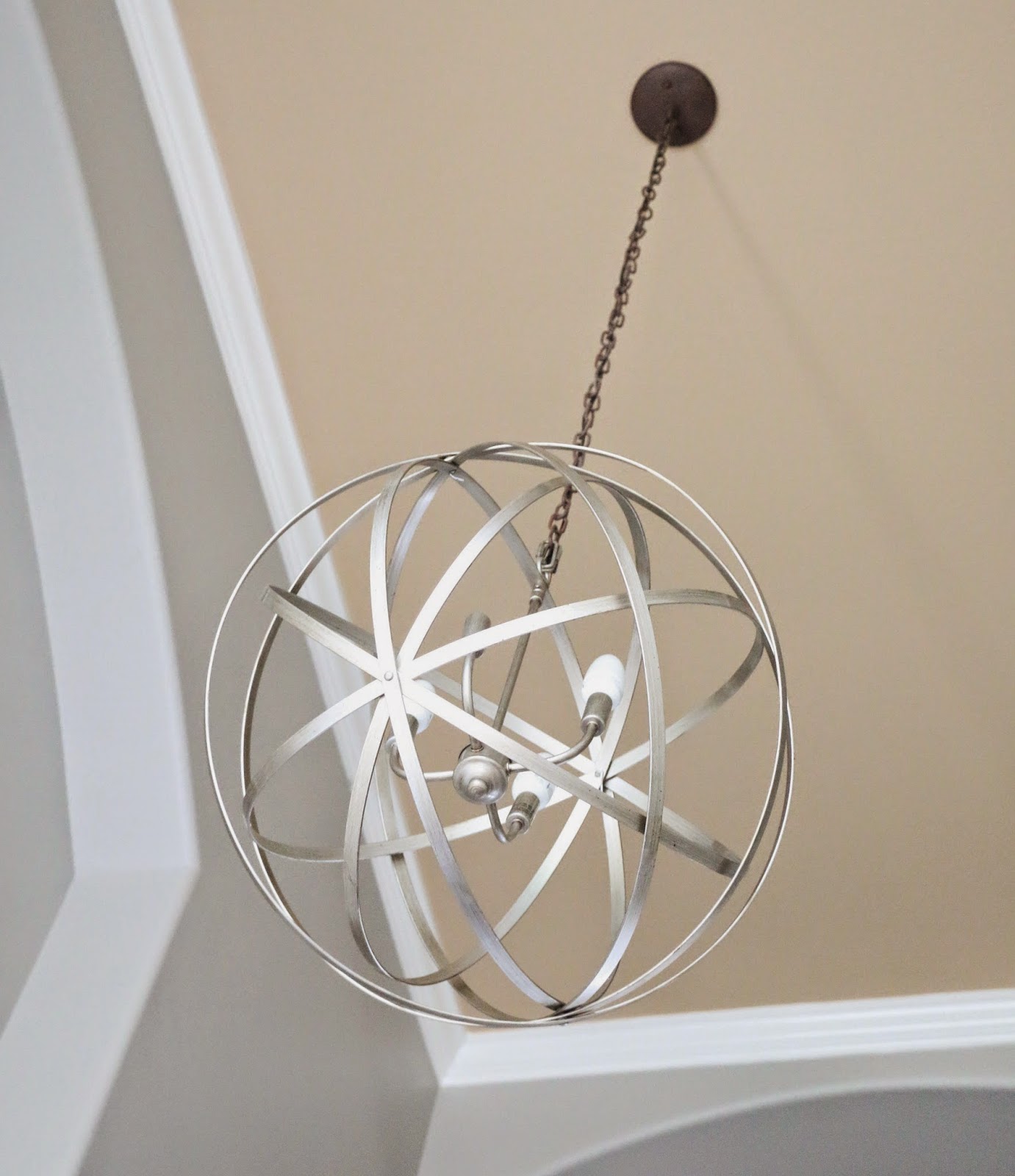 The only thing left was to turn the power back on and admire my new foyer light. The only real issue with this method (aside from the fact that the two wires are spliced together outside of the ceiling canopy) is that the chain and ceiling canopy are a different color than the new light fixture. Normally this would bother me, but the light is so high up, it really is hard to tell from the ground. Eventually we plan on repainting the ceilings here and in our living room, and we will need scaffolding for that, so we can always change those out at that time. Otherwise, I am happy that we finally were able to get this light up and didn’t have to rent a large lift just to do it.