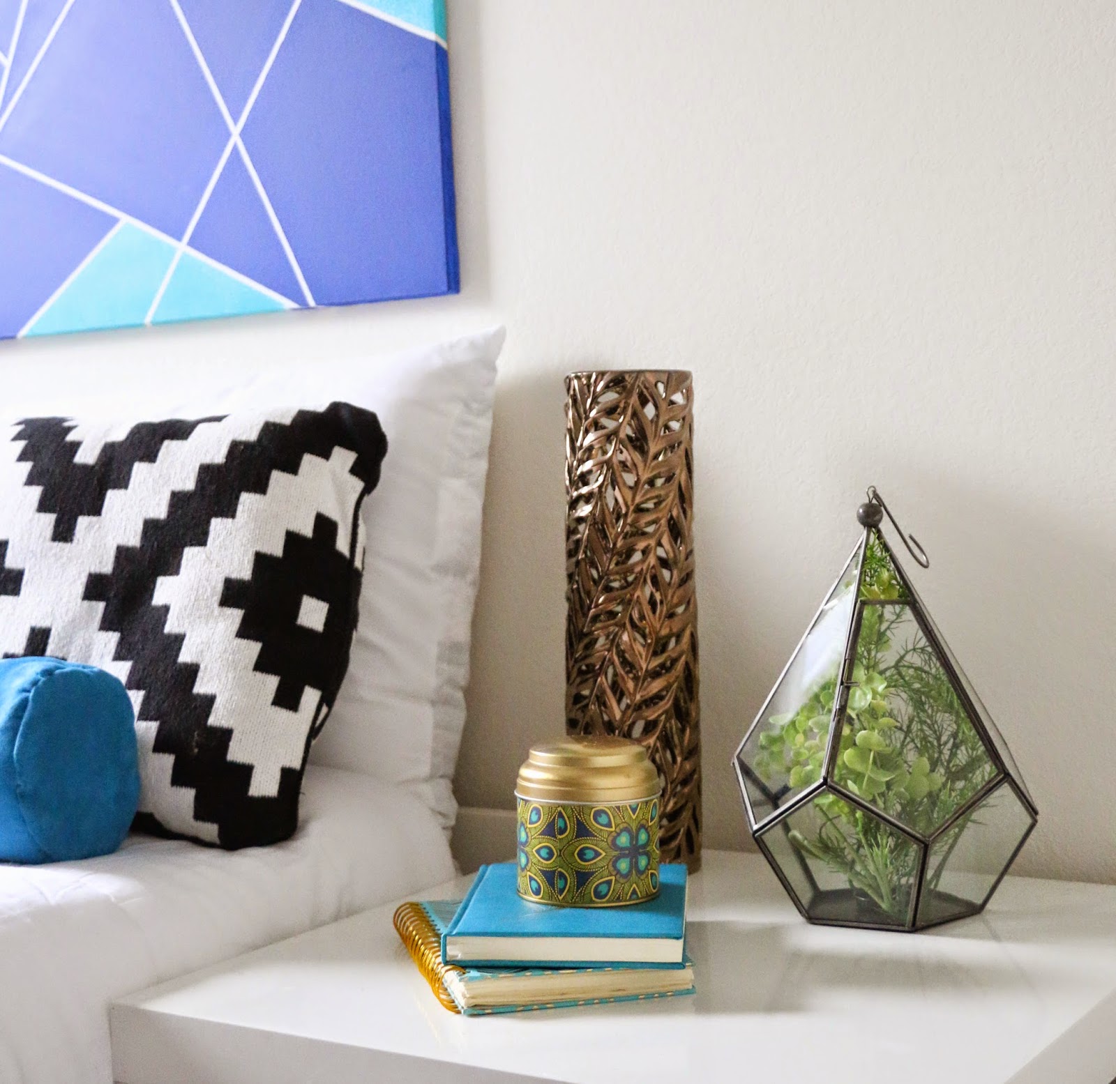 I have been working on decorating my guest bathroom lately which has also got me thinking about what I want to do with our guest room. Given it really isn’t used much, but right now it is just a hodge podge of different items that didn’t work well in the rest of the house and a bed. One easy thing that I did do for the guest room was make a geometric painted canvas headboard.