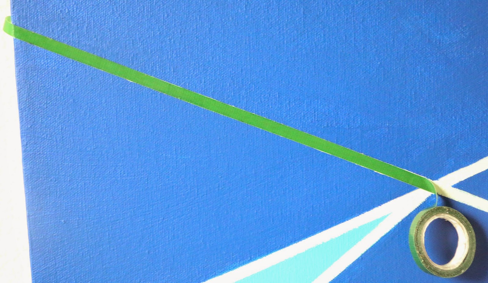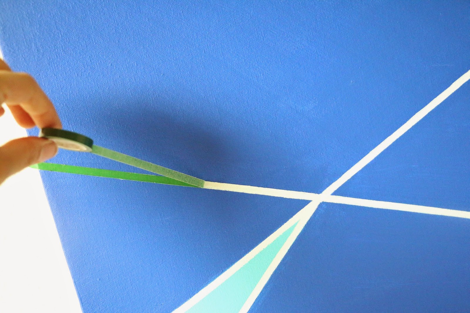 Now you just tape off the canvas with strips on tape going in various directions. There is no rhyme or reason to the tape pattern, just do what you like and be sure to overlap the tape in some places to create an interesting pattern. Once your canvas is all taped to your liking, use your craft paint to paint the canvas. I wanted the two canvases to play off each other, so I painted some of the light blue from the top canvas into some of the spaces of the dark blue canvas. I also used some light gold in some of the spaces of the top canvas to give it more dimension. Once your paint is dry, remove the tape (this is my favorite part).