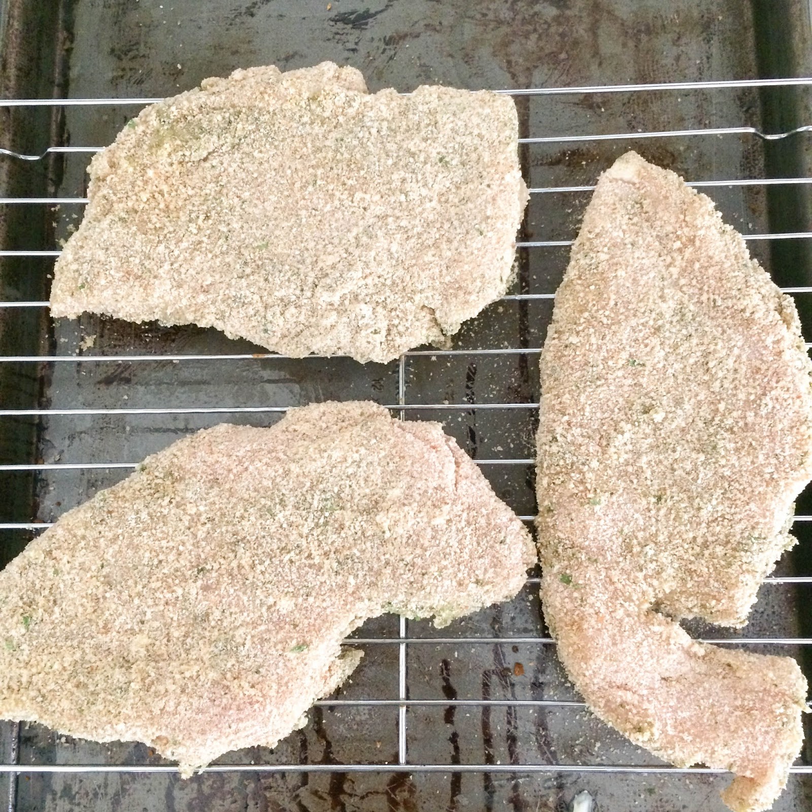 Once your chicken is coated on both sides with breadcrumbs, lay them out on an elevated rack over a baking sheet like so.