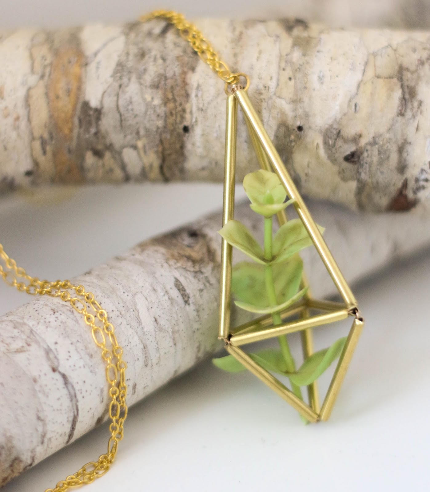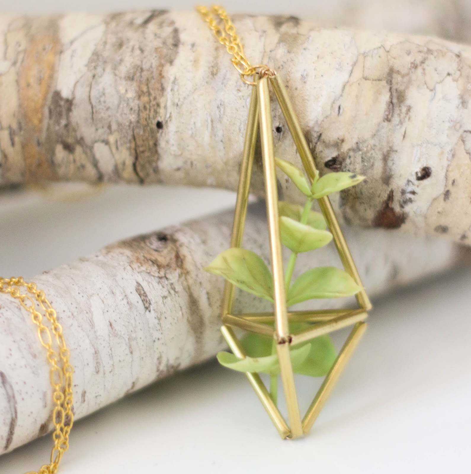 Now all that is left is to add your jump ring and jewelry chain to the charm and then place your faux succulent or mini air plant into the open space in the center of your brass himmeli prism. Now you have a fun brass planter that you can wear around your neck! If you want you can also insert a crystal or raw gemstone into the center of the prism before closing up the large triangle piece to create a fun boho necklace. One you get comfortable with the tubes and threading them on, the geometric shapes are endless. Just have fun and play around with it!
