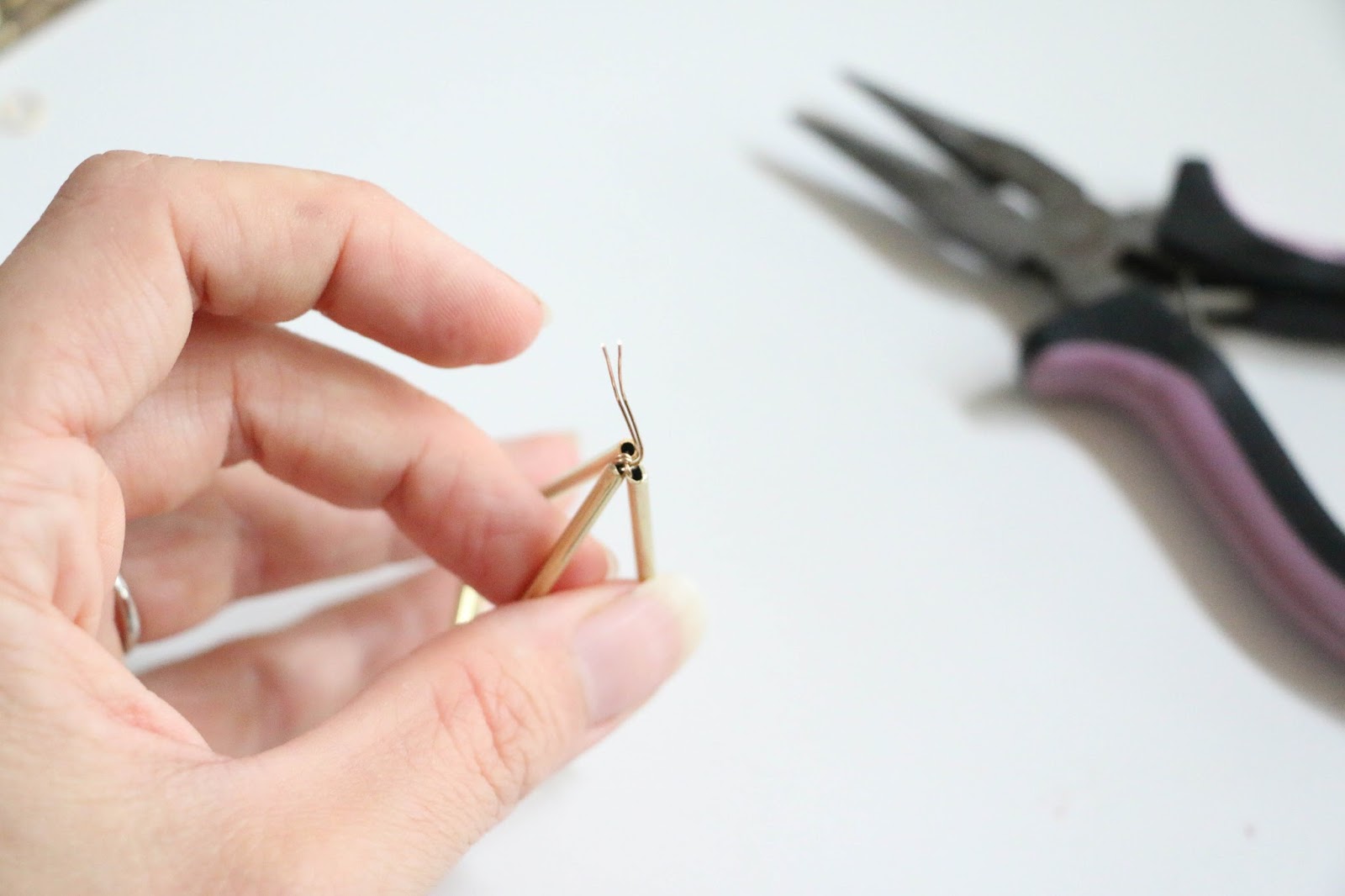 Once your tubes are cut, you will thread three small 1″ pieces onto the gold wire like so.