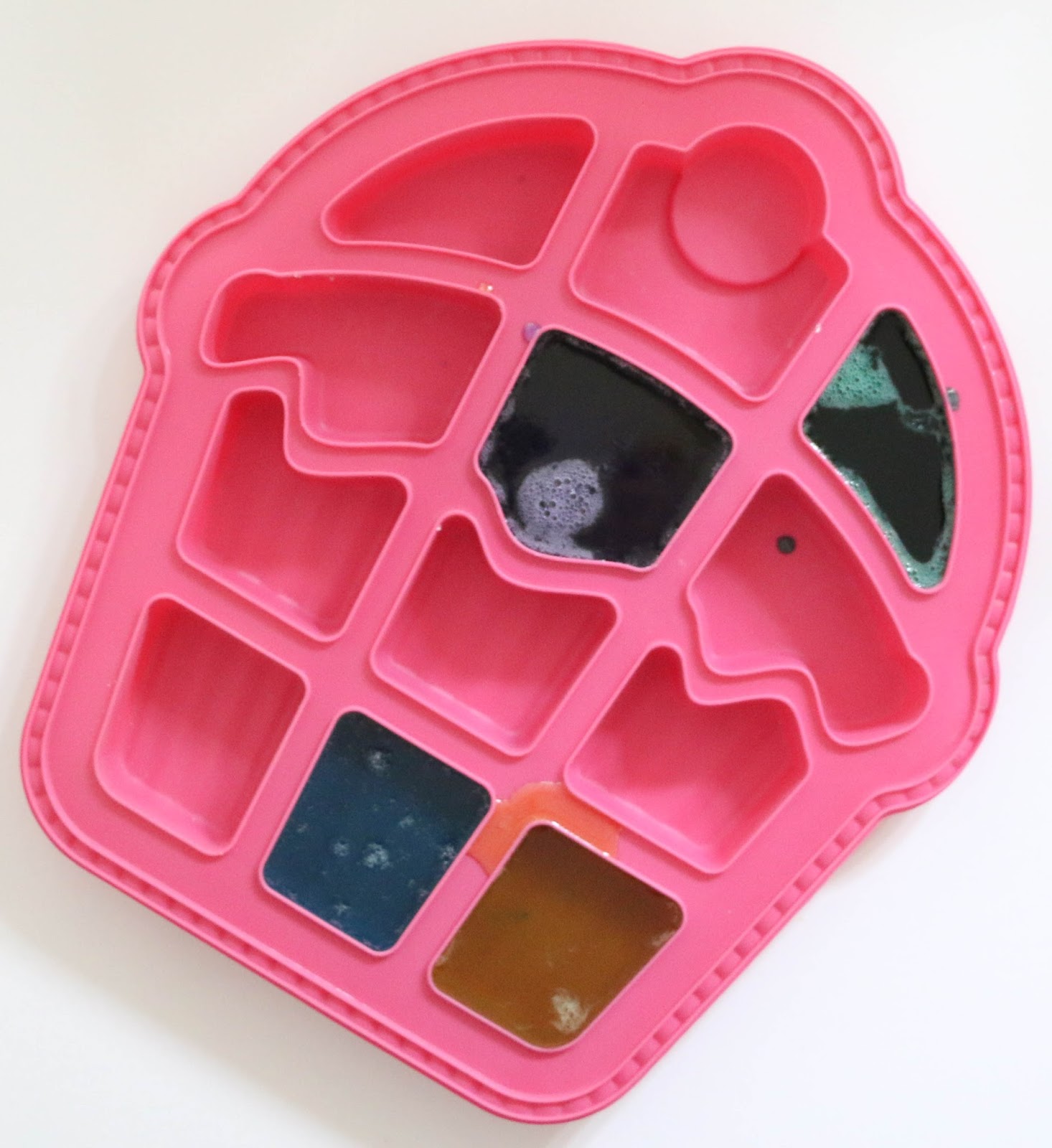 Now you will let it sit and harden. This will take about 30 minutes to an hour depending on the thickness and size of your mold. Once hard, you can remove your soap pieces.