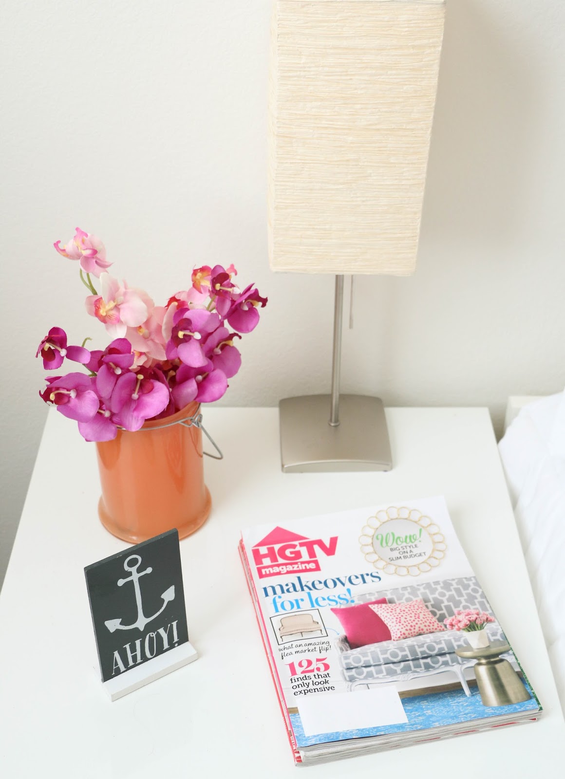 On the other side are some pretty faux orchids in a summer orange bucket vase, an ahoy sign picked up in the Target dollar spot, some magazines with fun summer colors on the front, and a light paper shade lamp. I was also able to find this small mint rug at Home Goods for quite the deal, and it adds a nice summer brightness to the dark wood floors.