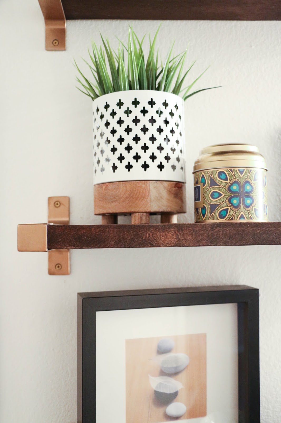 I have seen several IKEA hacks using the EKBY BJÄRNUM shelf brackets, but my favorite use of the has to be this usage from Lay Baby Lay. I love the warmth of the barn wood and gold edge brackets.