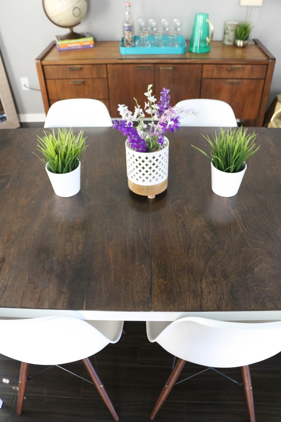 Once the chandelier was up (my husband and I installed it ourselves), the decorating began. I recently made over our dining table (you can read more about that in the link above) playing on the mid century modern look of dark stained wood and white. Once the table was done, I needed new chairs, because the old traditional black ones just wouldn’t do. I purchased these reproduction Eames Eiffel chairs online and went with the walnut legs and white plastic seat to coordinate with my dining table.