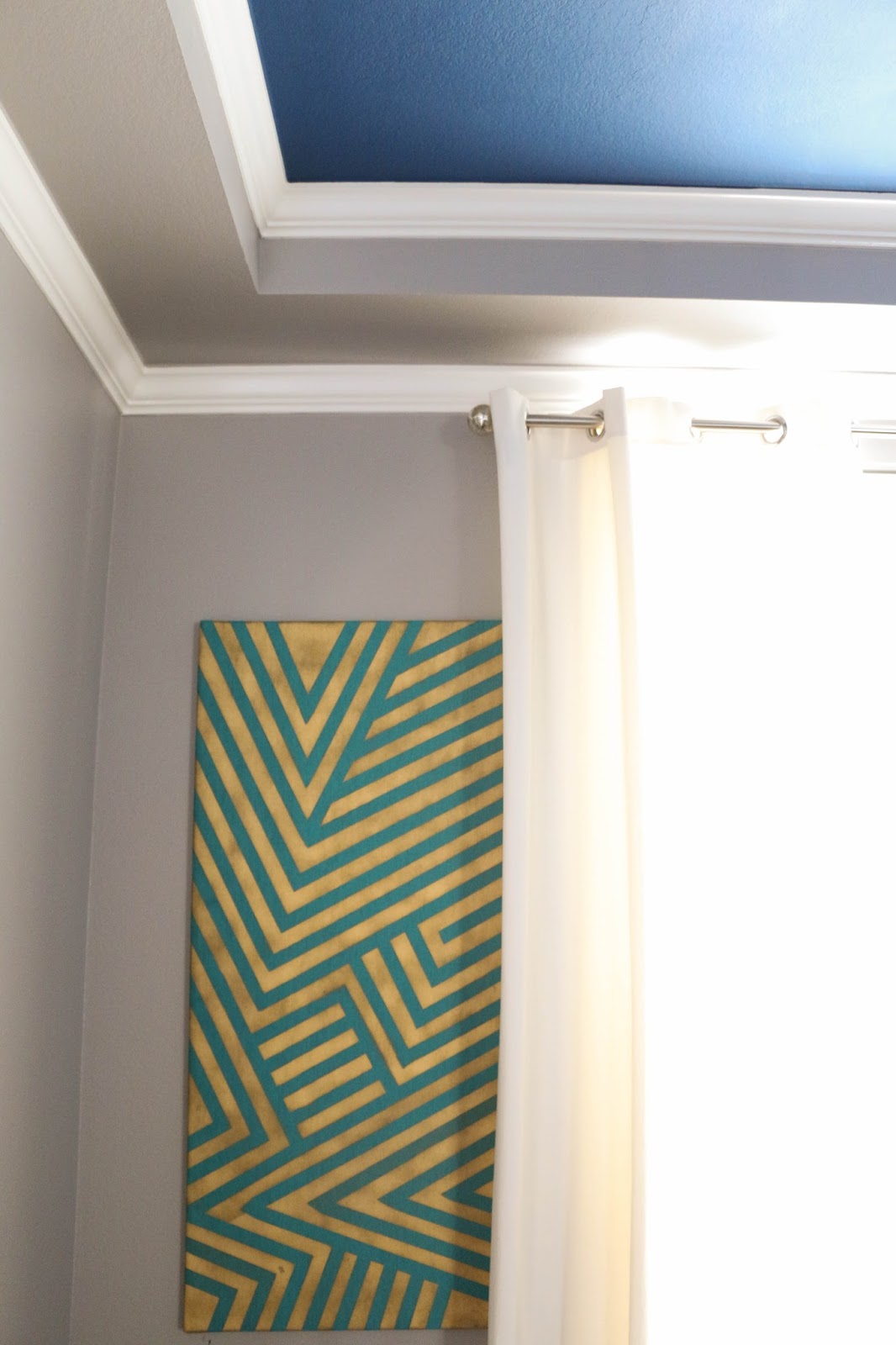 Next on the list was paint. I went with a gray (Rocky Bluffs by Valspar in eggshell) on the walls, and decided to paint the tray ceiling a pretty Navyish blue (Indigo Cloth by Valspar in Flat).