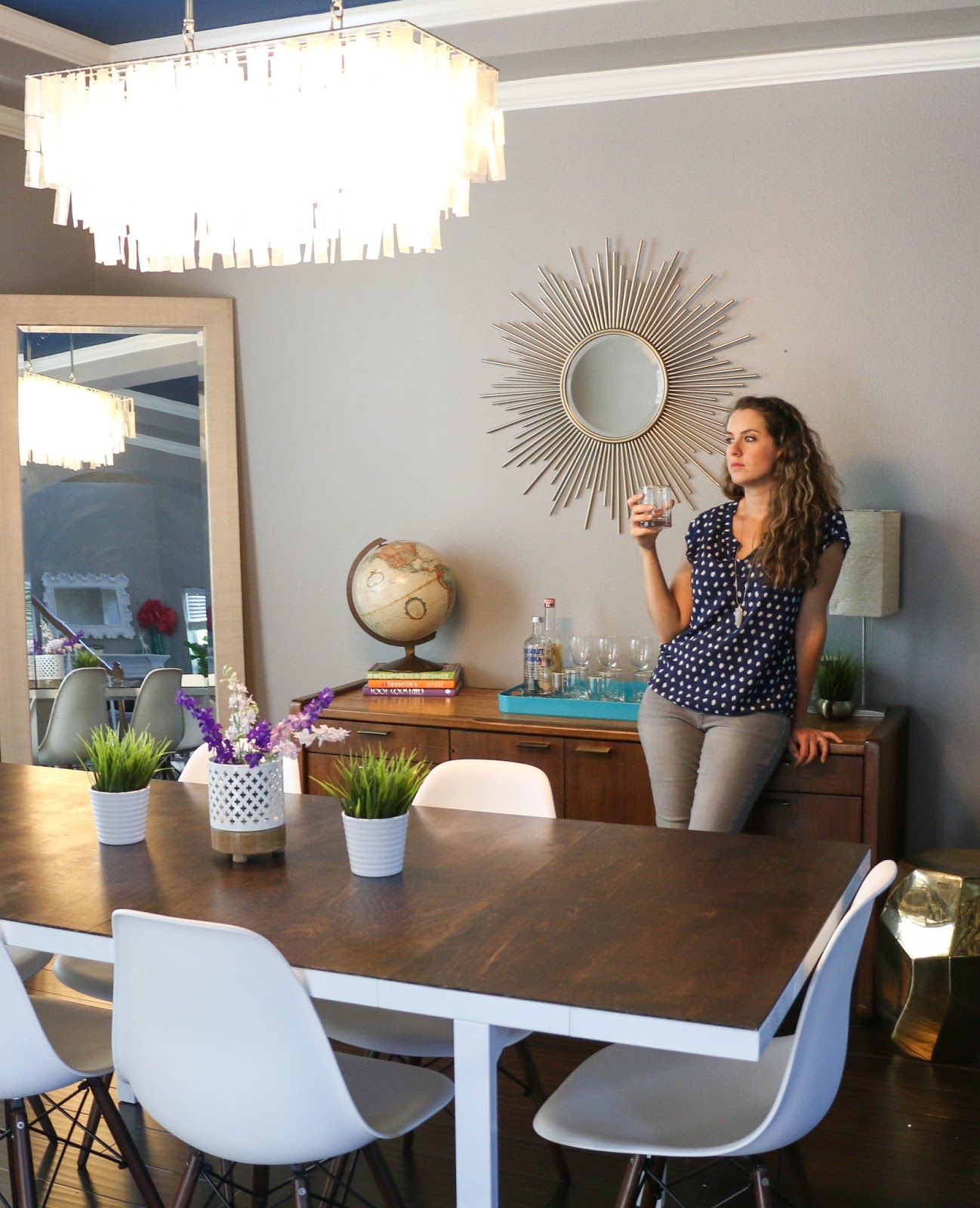 The capiz chandelier from West Elm was a little tricky since this front space didn’t have a light fixture box. Since it was originally intended to be used as a living space, all they had was a light switch tied to an outlet for a floor lamp. Of course my dining table needed a beautiful chandelier, so I had to have an electrician come in to install an electrical outlet in the center of the tray ceiling. He was able to tie the electrical wires into the existing light switch, and only had to cut a small hole in the ceiling to do so. If there had been attic space above this room, then the hole wouldn’t have been needed, but unfortunately our master closet resides above this room. Luckily my mom’s boyfriend is a painter and was able to patch and retexture the hole for us. The total cost for the electrical work in this room was around $400.