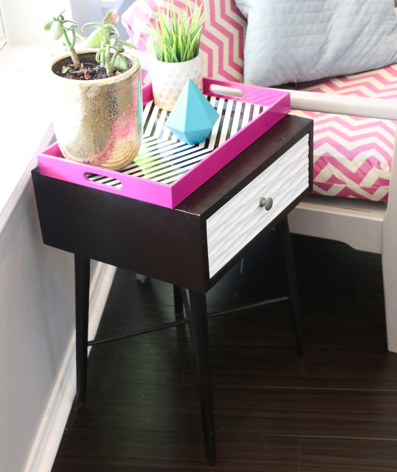 Last but not least is the tall side table that is in the seating area of our bedroom. I think that this table is technically a butler’s table, but I use it to hold some of my design books that I like to peruse from time to time. This table came from World Market (I see a trend, World Market, Home Goods, Target, ahem…). In the photo you can also see my set of gold rimmed pink agate tie backs that I DIY’ed here, and my yarn pom poms on sticks craft project.