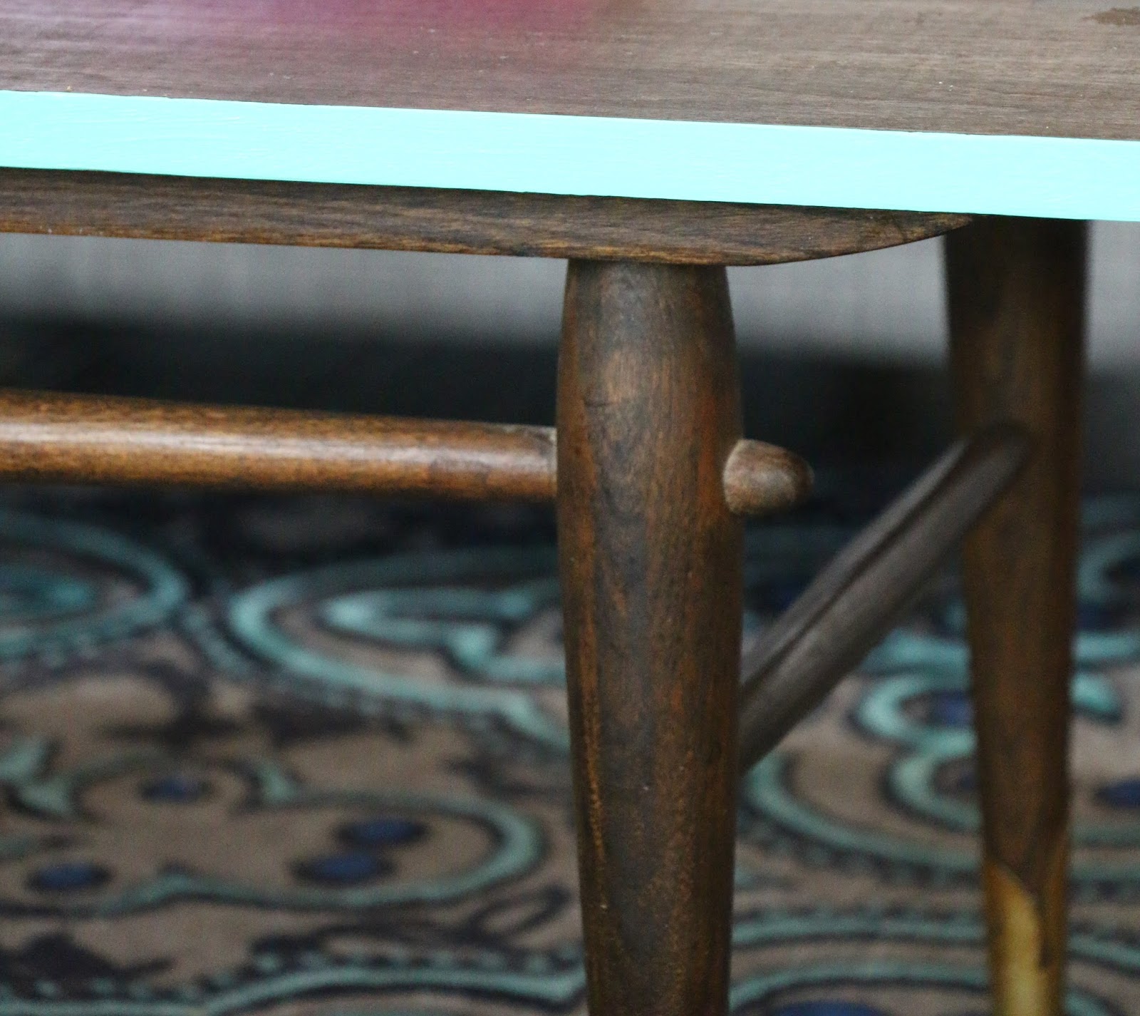 Once the glue dried for a full 24 hours, I carefully flipped the table around and added some turquoise blue accent paint around the sides of the new wood top. I used Martha Stewart Craft paint for this, but regular old Latex paint will work too.