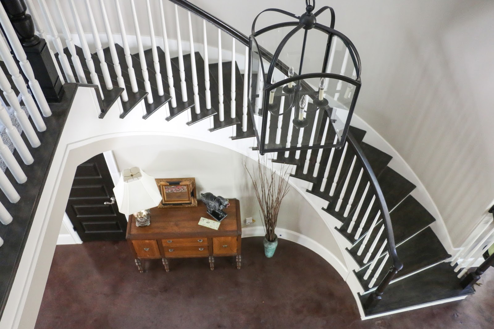 Next up is her entry way and curved grand stair case. I love the wood and white risers along with the dark handrails.