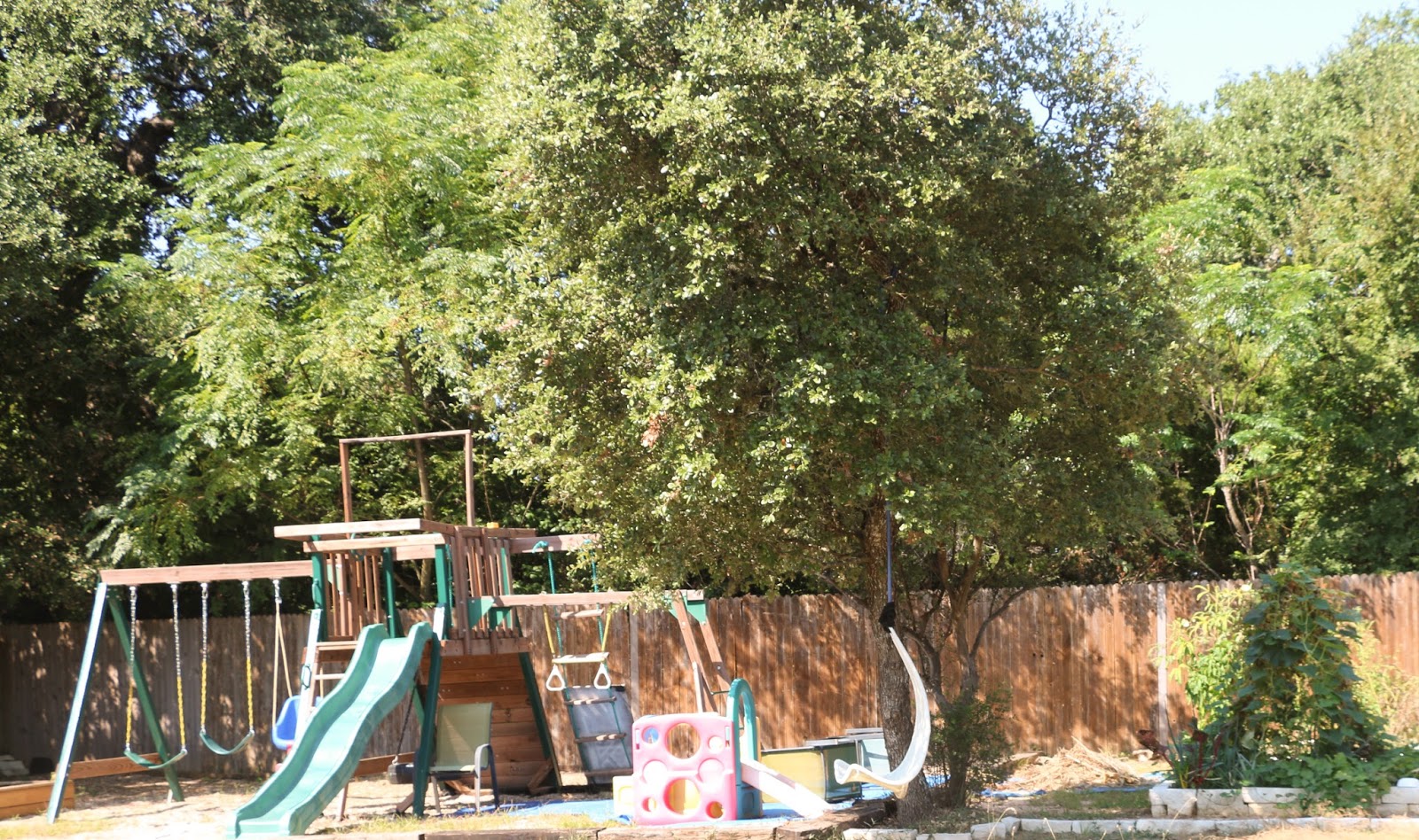 The back of the yard is where the playscape and storage shed were when we moved in. They are still there, but we added railroad ties around the playscape and added pea gravel in there for the kids to both play with and to make a better play area for them.