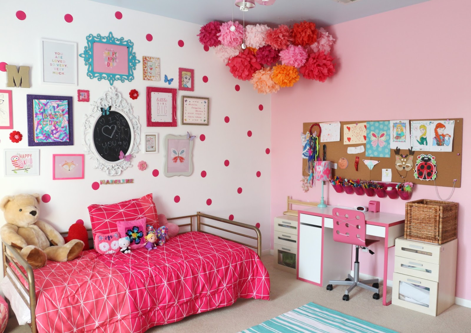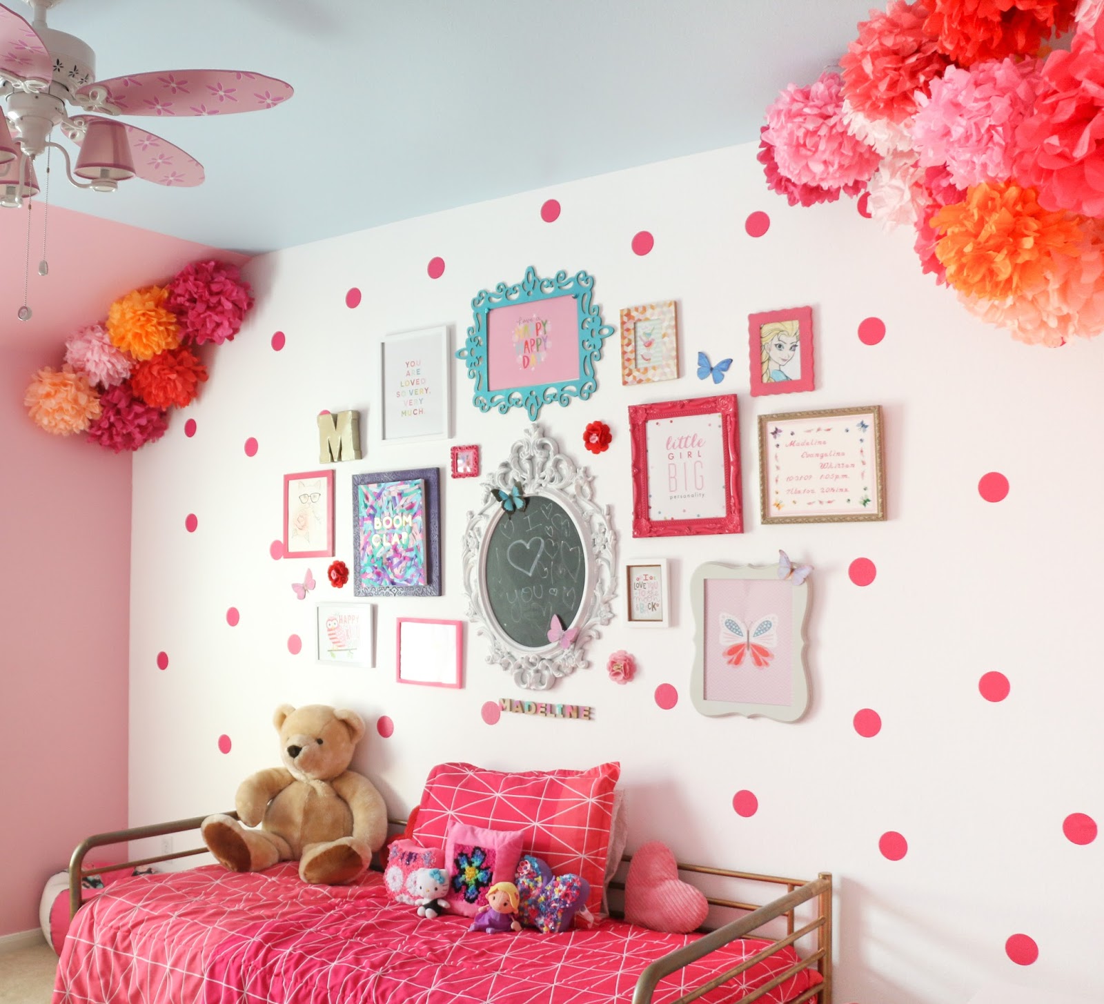 Today for Home Tour Tuesday it is all about Madeline’s bedroom. This room was pink when we moved in and Madeline immediately claimed it as hers. Despite it being the smaller room, she just knew that this room was meant for her because of the pink walls and butterfly fan. I slowly encouraged her to let me paint one wall white to make into a feature wall because I just couldn’t handle all that bubble gum pink! I love pink and all, but it was just too much in the space. Selfish I know, but I made that wall into something fun that she loves and it helps break up the sea of pink that was once there. And I should also mention that she is VERY opinionated about the design of her room, so she has had quite a bit of the say so in decorating her space (like the cherry blossom wall decal, her glitter pink chevron dresser, and her art station), so it was like working with my first client and having to take their opinions into consideration when decorating this space.