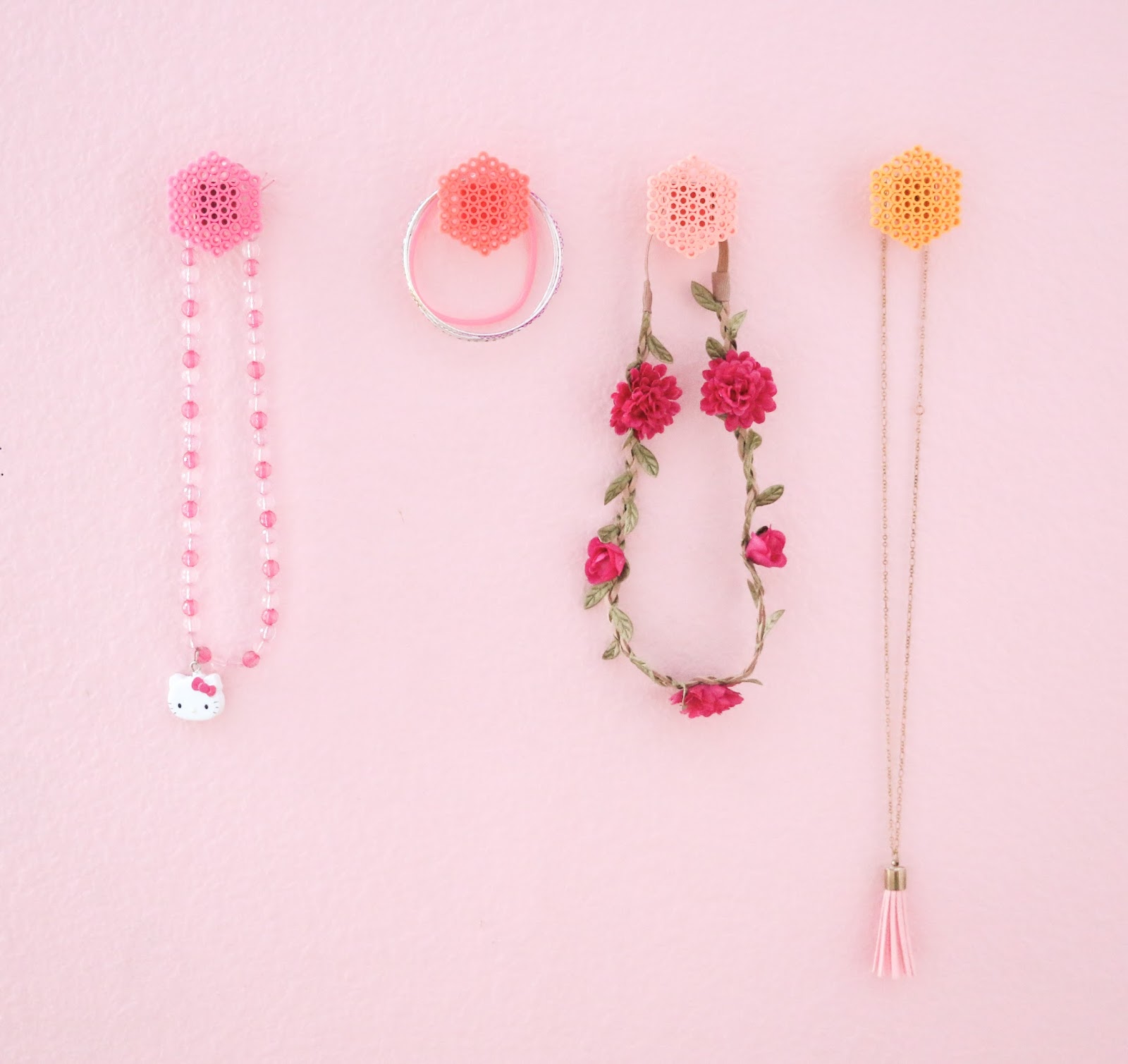 On the left side of her bed are two poufs that I purchased at Target as well as her window, ombre perler bead jewelry hooks (find the how to here), and her dresser.