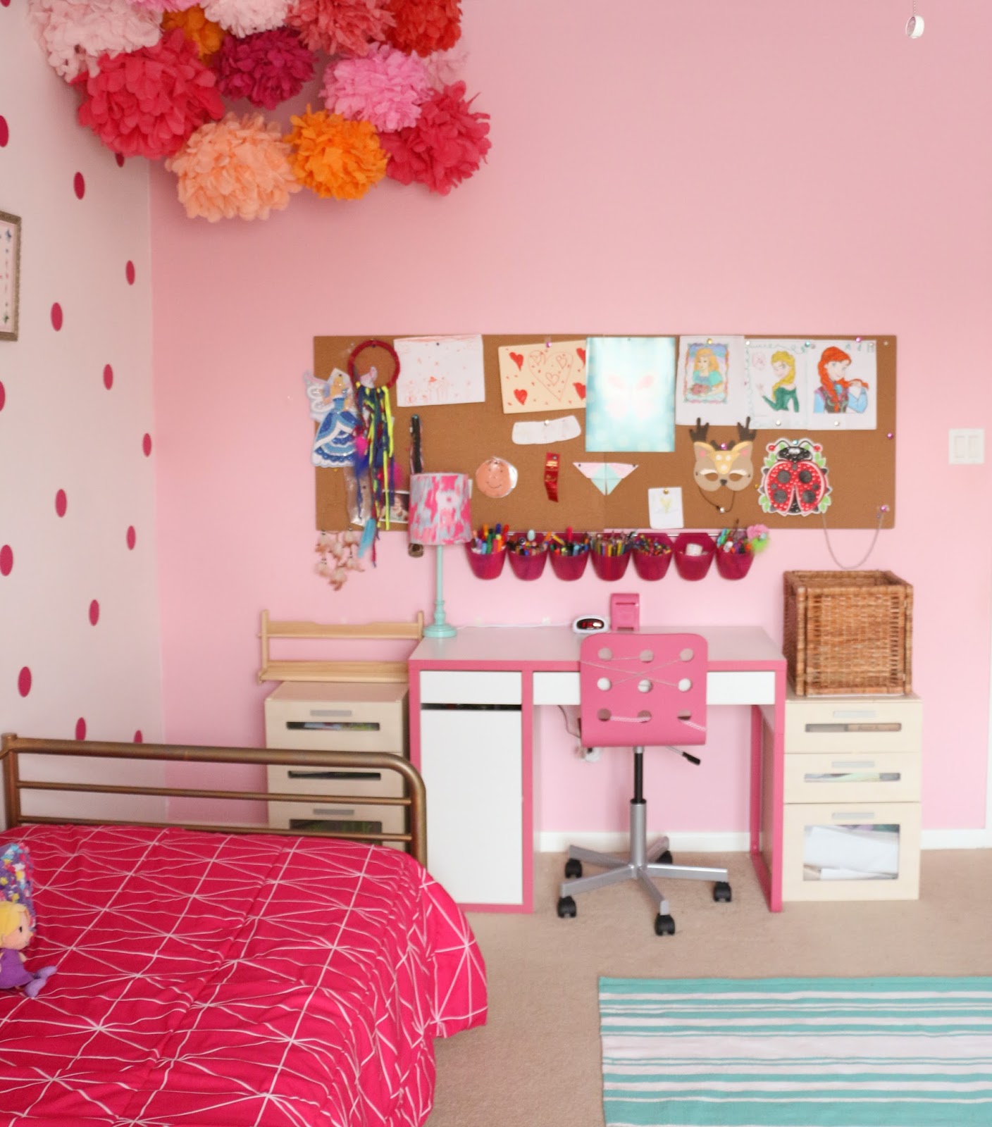 I purchased her pink and white desk from Ikea and used the metal rail and pink plastic containers from Ikea to hold all her markers, crayons, colored pencils, scissors, glue, etc. Above her desk I hung two large cork boards from Hobby Lobby so that she could display all her art work. Her desk cabinet is filled with mason jars full of fun craft supplies like colored popsicle sticks, pipe cleaners, pompoms, foam stickers, washi tape, beads, and other random craft items. And the drawers on the left are filled with paper of all kinds and activity books while the drawers on the left are filled with extra artwork.