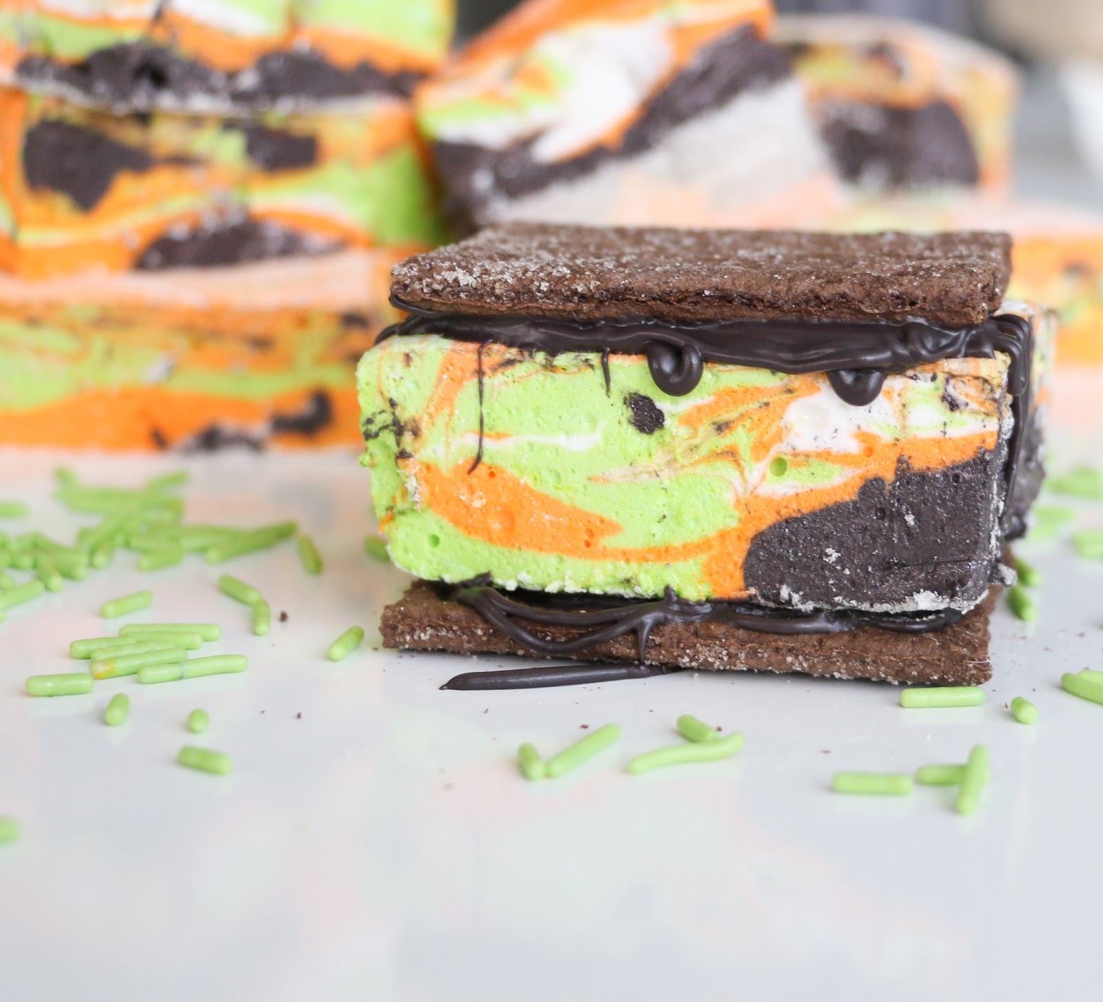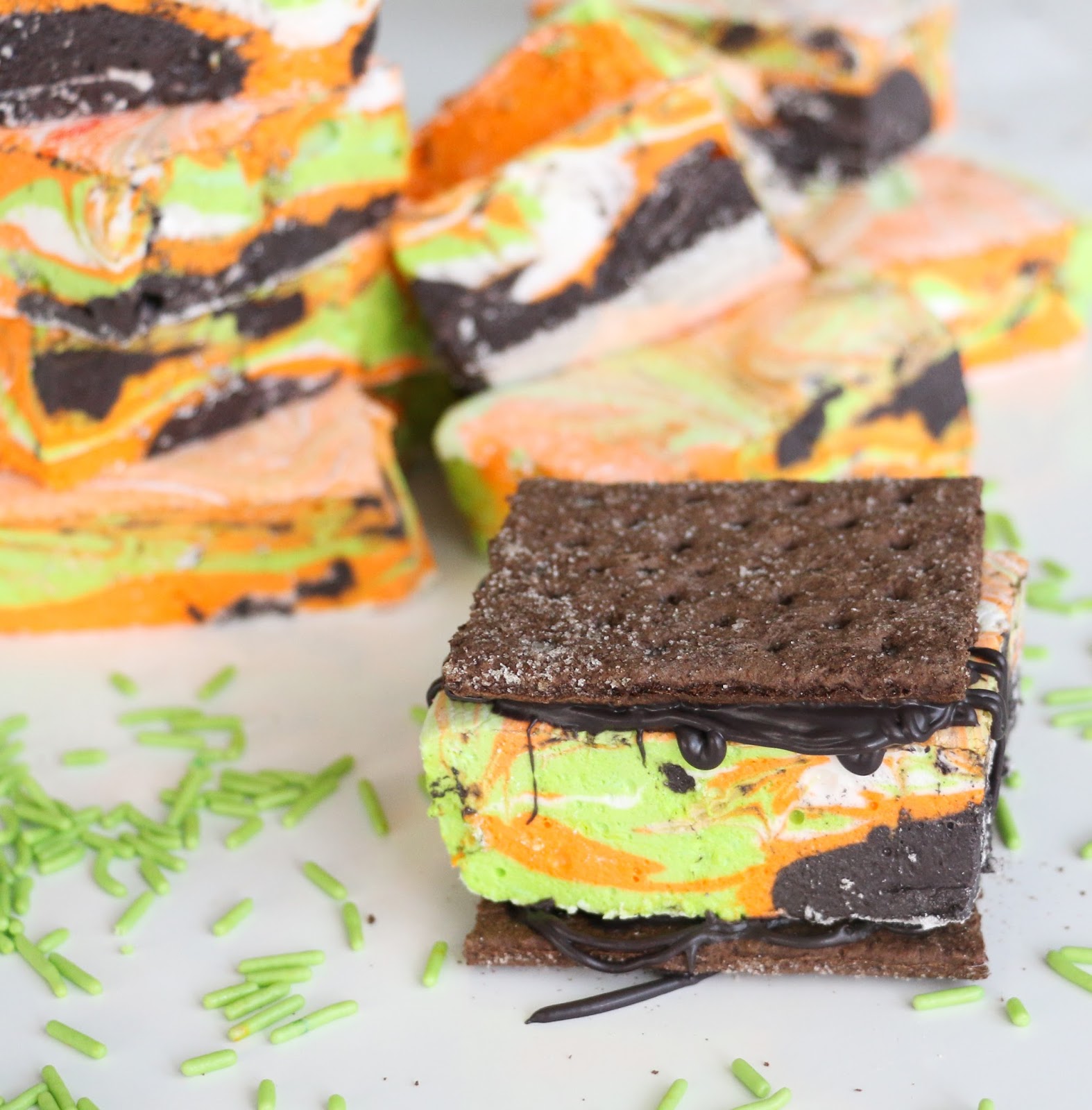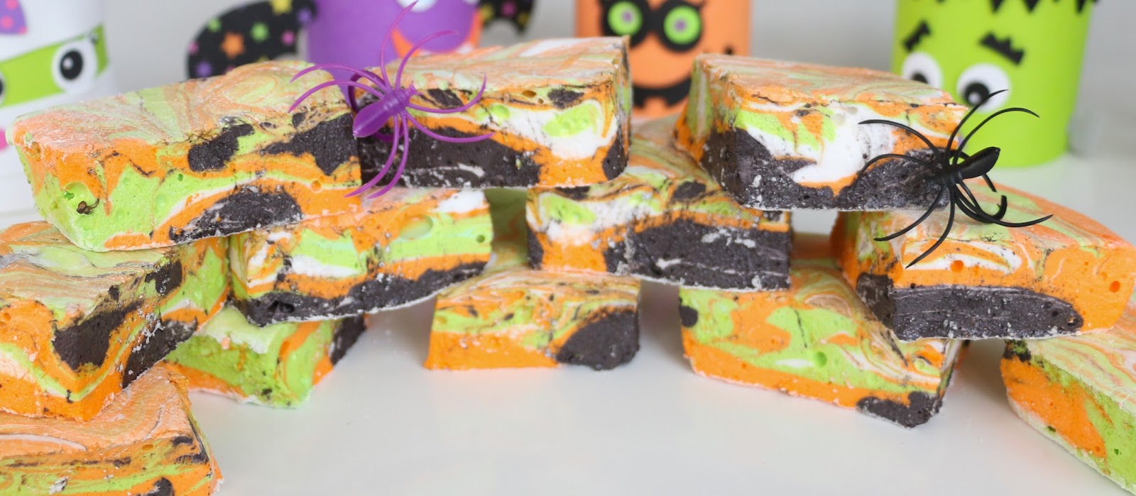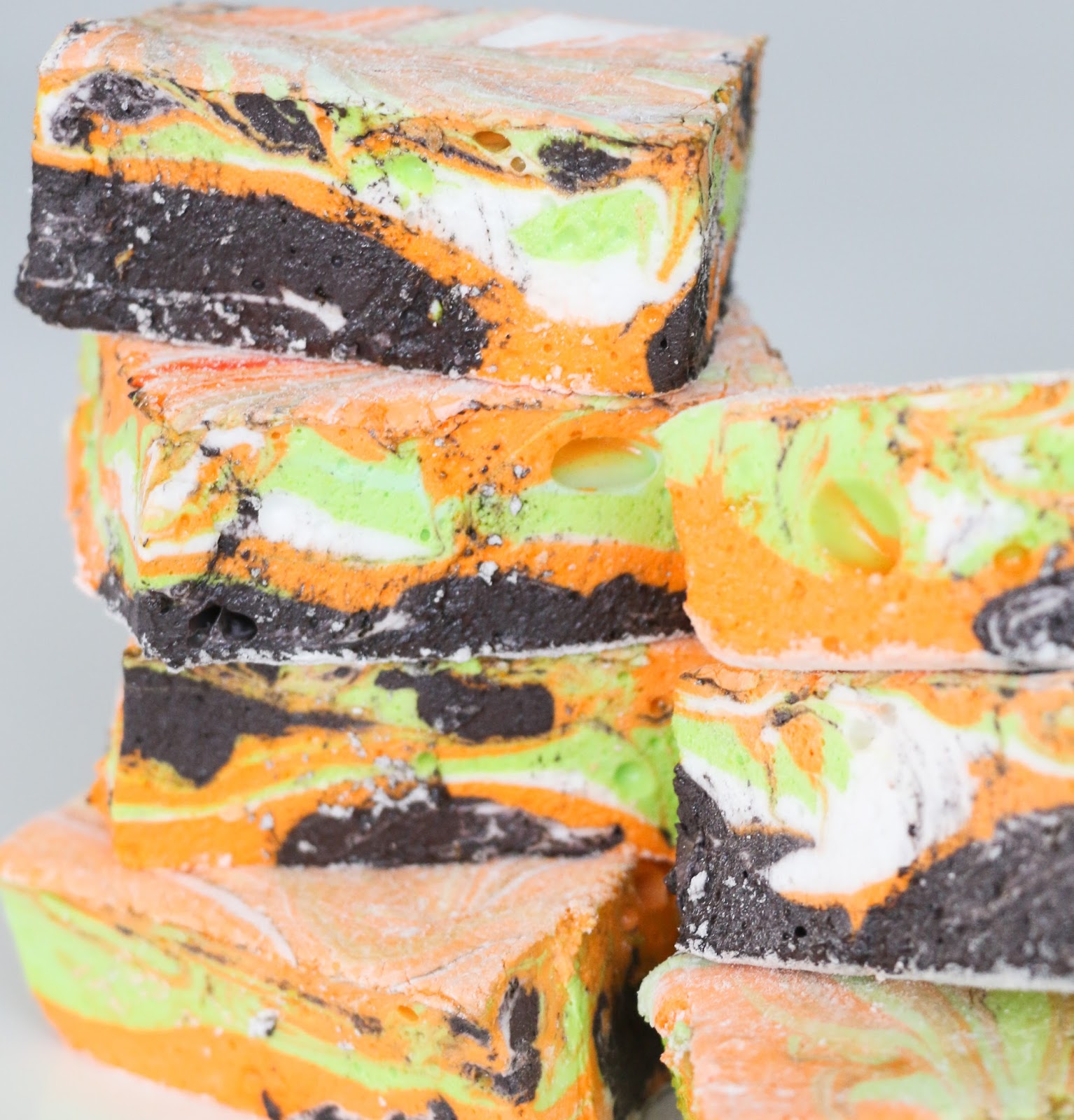 Once the marshmallows have had time to set, use kitchen scissors or a sharp knife to cut into squares. Then pair them with some melted black candy melts and chocolate graham crackers to complete the Halloween look.