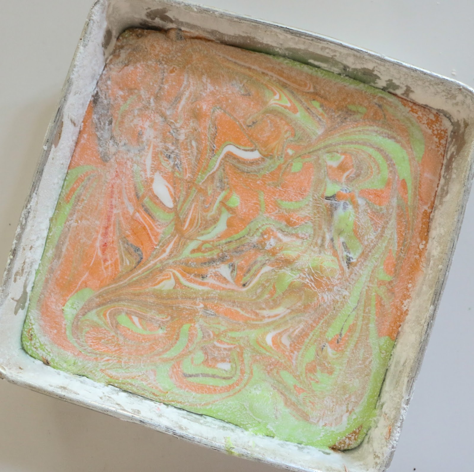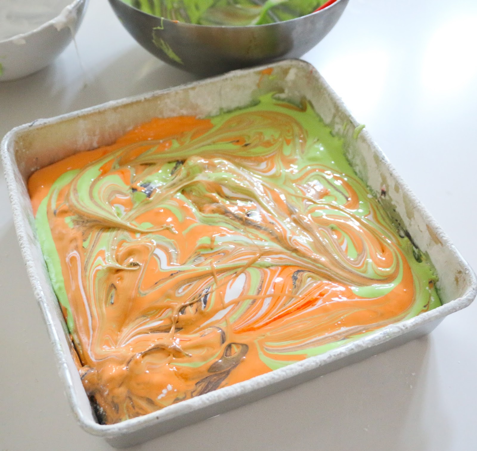 or spoon to gently swirl the mixture to create a marbled effect. Kids love this part (as you can tell from the little hand doing the swirling for me).