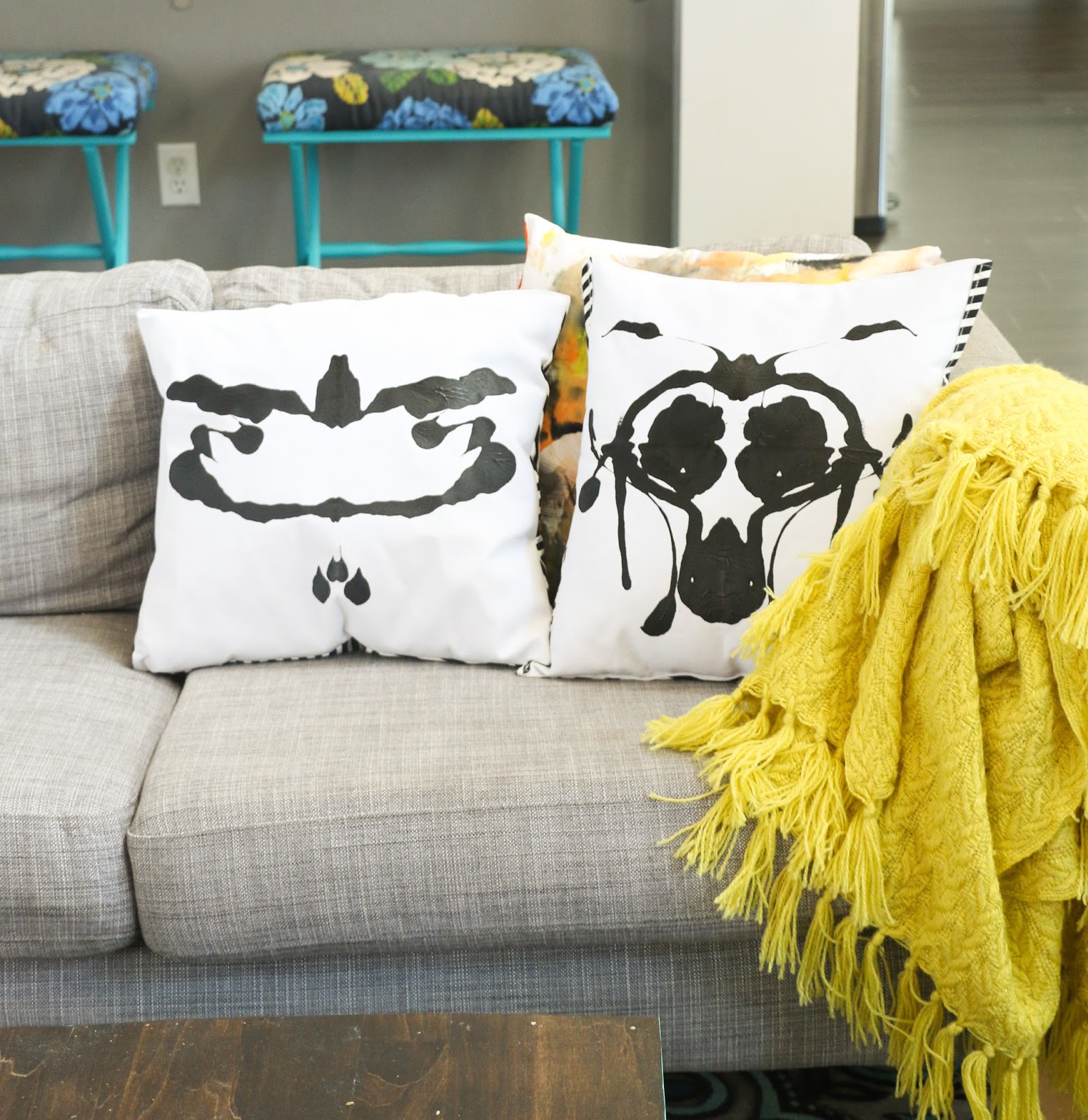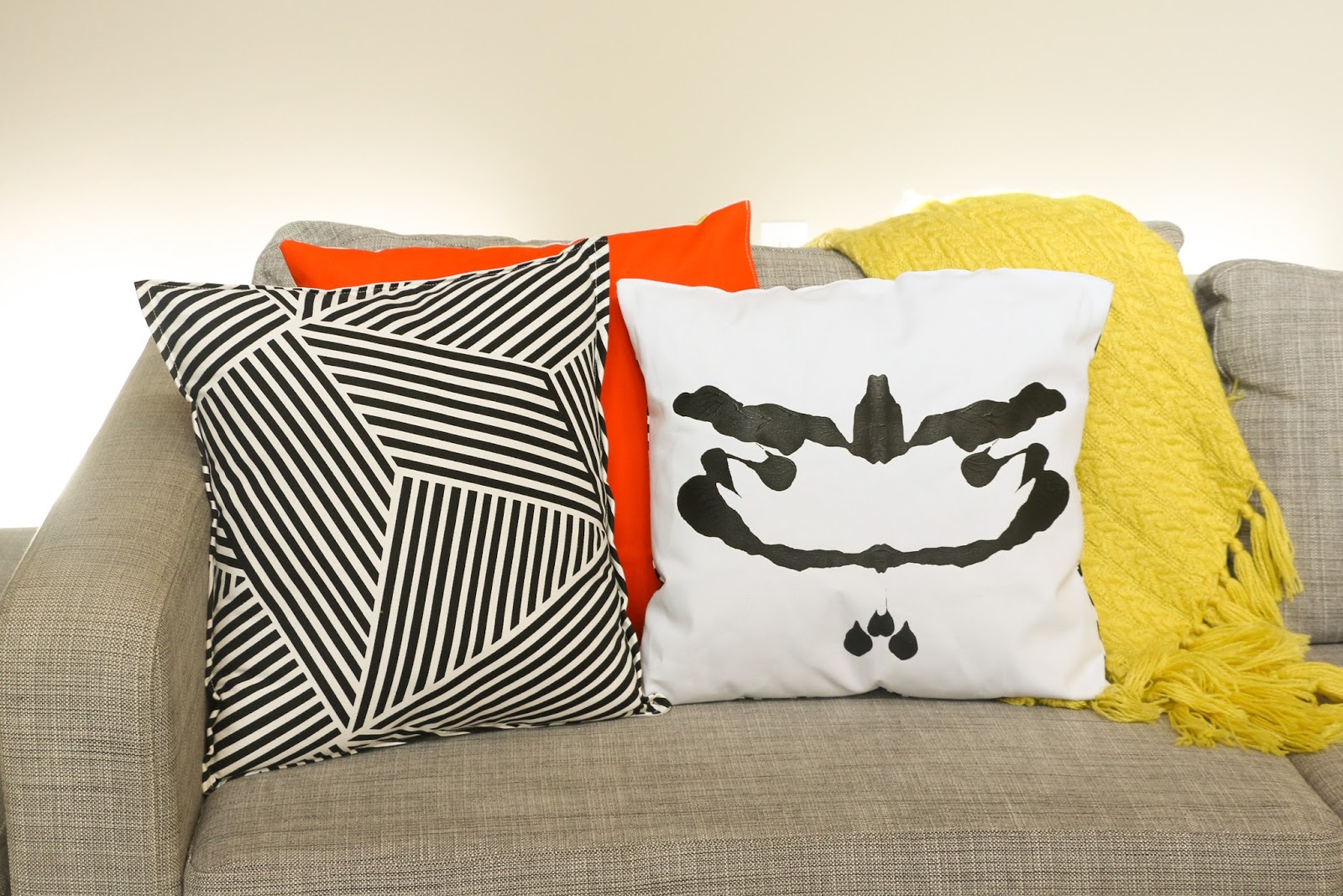 Once the paint was dry (I let it dry overnight), I ironed the creases out of the fabric and sewed it into a pillow using a black and white geometric print on the reverse side of the pillow.