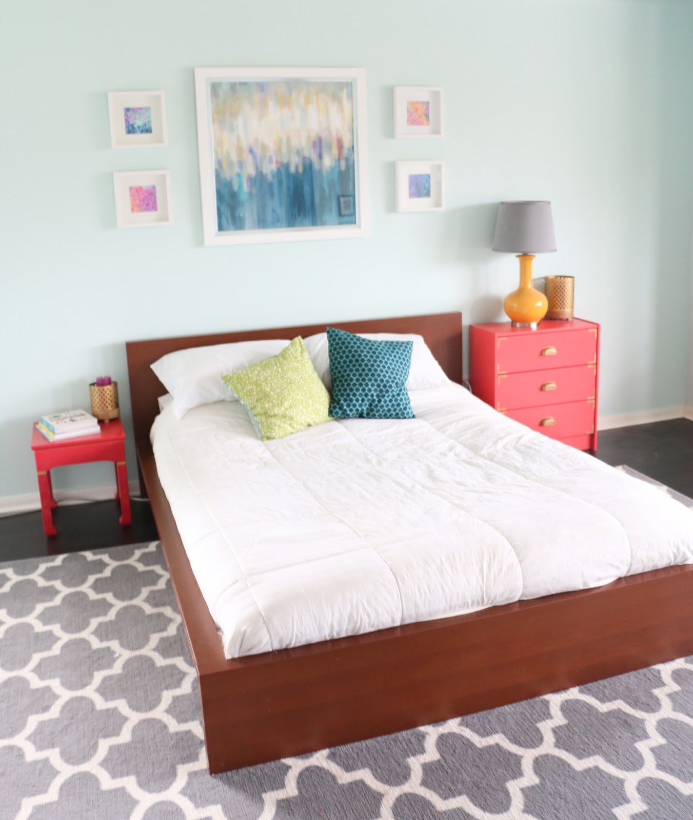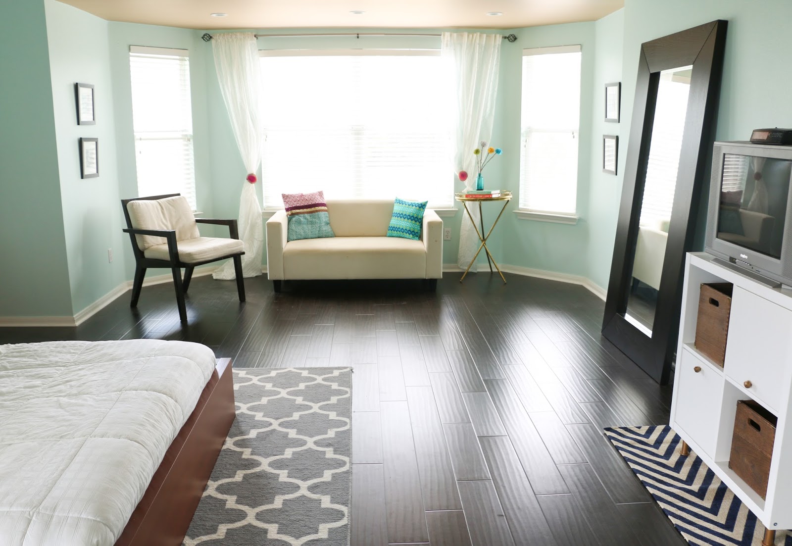 Today is all about our master bedroom and it is a very picture heavy post. This is a space that we rarely spend much time in aside from sleeping, so the design is fairly minimal. We only recently added the TINY couch that used to reside in our playroom. But, I do love the mix of colors going on in here. Especially the wall color (gossamer sky by Valspar) which changes color in the sunlight. Sometimes it appears to be very light blue and others it takes on a seafoam color. To me it always feels light and airy which is a big change from our previous master bedroom which had dark chocolate colored walls. We have plans to upgrade to a king size bed soon (we currently have a queen), and hopefully with that change will also come a new adult headboard and frame. The one that we currently have is from Ikea, and while it was nice to have a low bed for a while, we are definitely ready for the change to adult bed! Take a look and let me know what you think or if you have a questions about particulars.