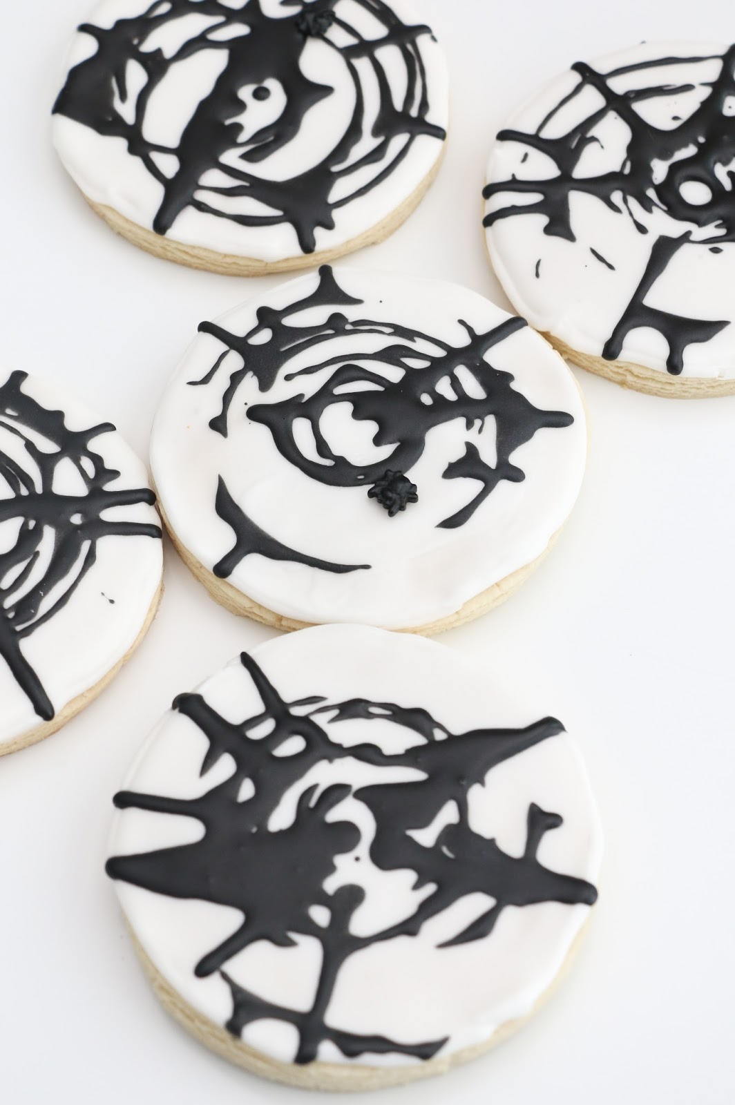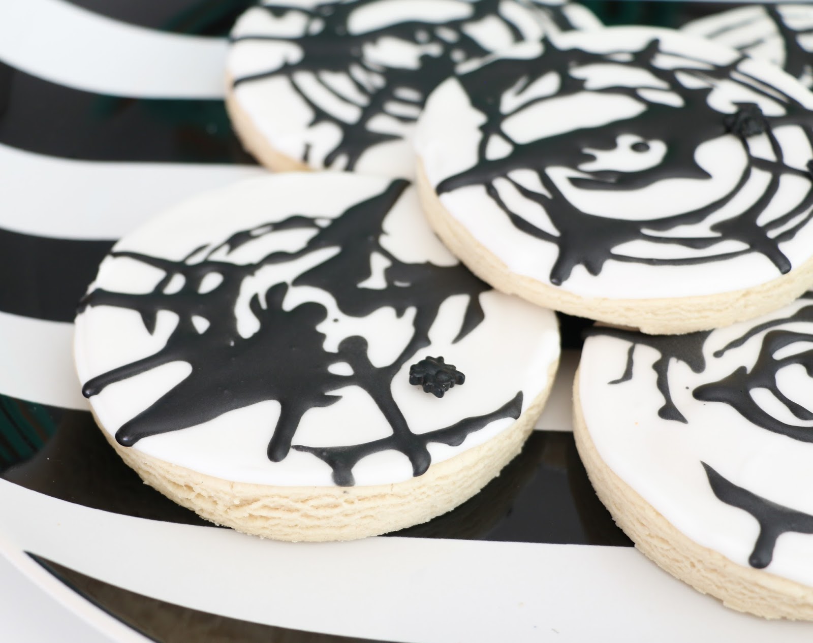 They are a little bit Rorschach looking and a little bit spider web looking and a whole lot of Halloween awesomeness! To make your own spider web spin art cookies (or better yet, let the kids do it because it is oh so fun and would make an awesome Halloween party activity), you will need some plain white iced sugar cookies, think black royal icing, a piece of fondant or gum paste, a squeeze bottle, and a spin art machine like this Melissa and Doug one.
