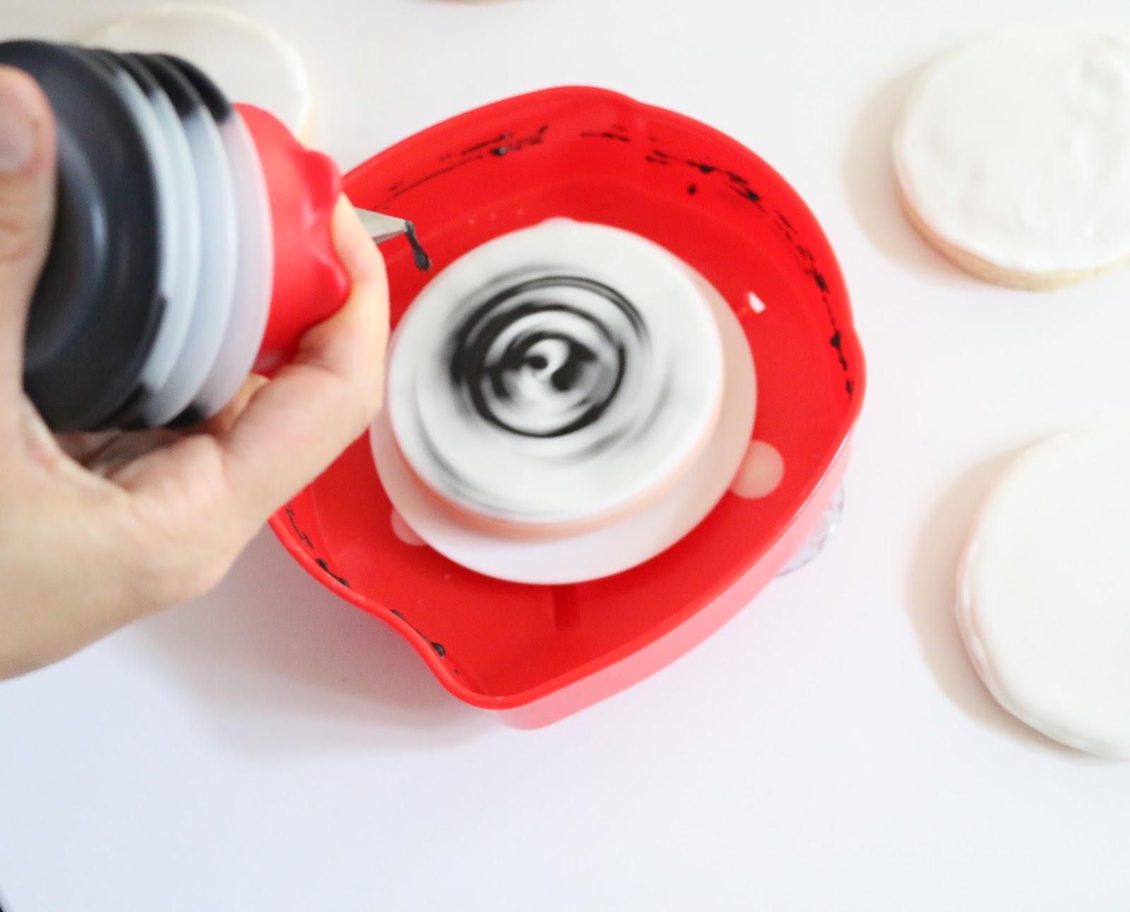 Once the cookie is in place, spin the cookie and squeeze out the icing onto the cookie just as if you are making a piece of art.