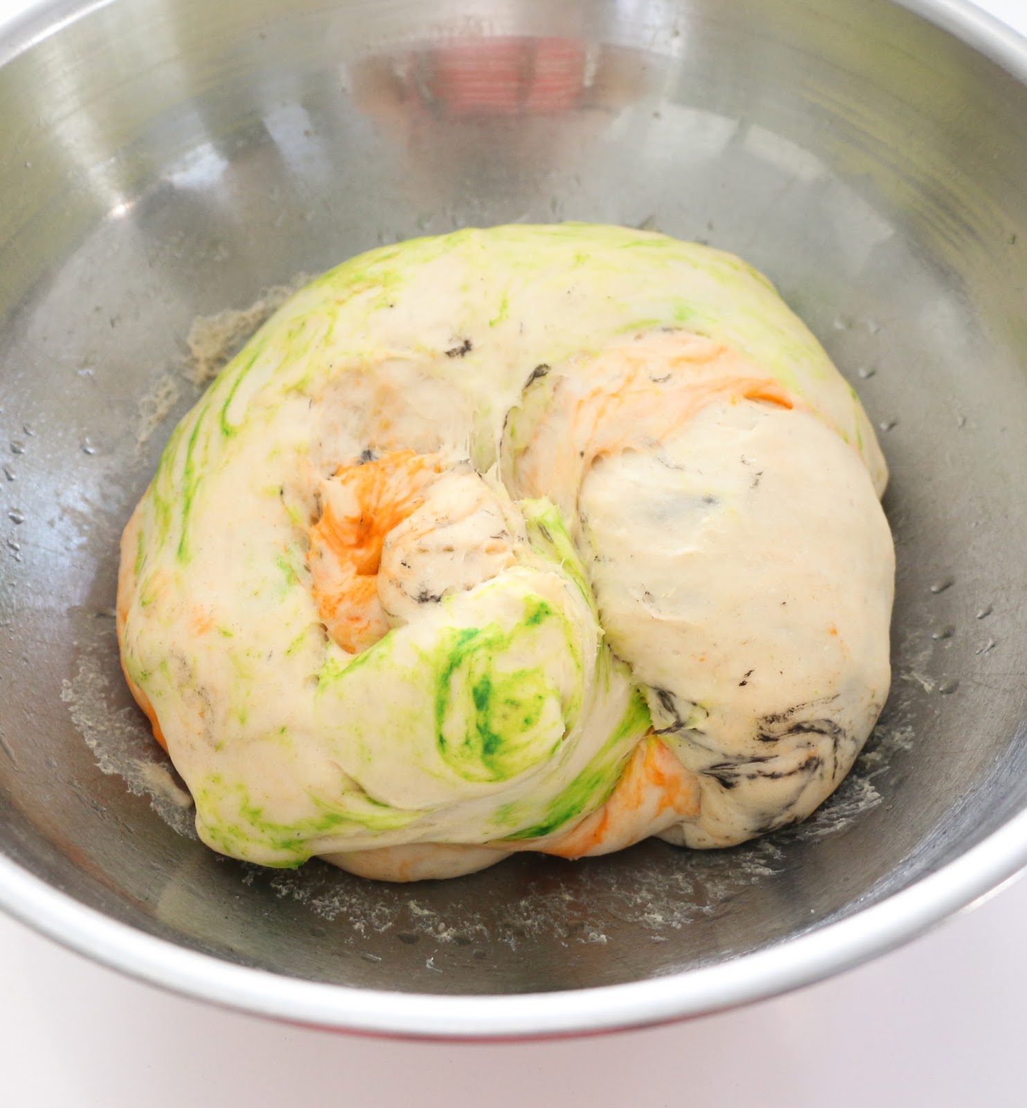 Once you have your once risen dough, punch it down and divide it into three (or more if you want more colors) balls. Add your food coloring to the center of each ball and knead it to distribute the color. I only worked the color in a bit to get a more marbled look.