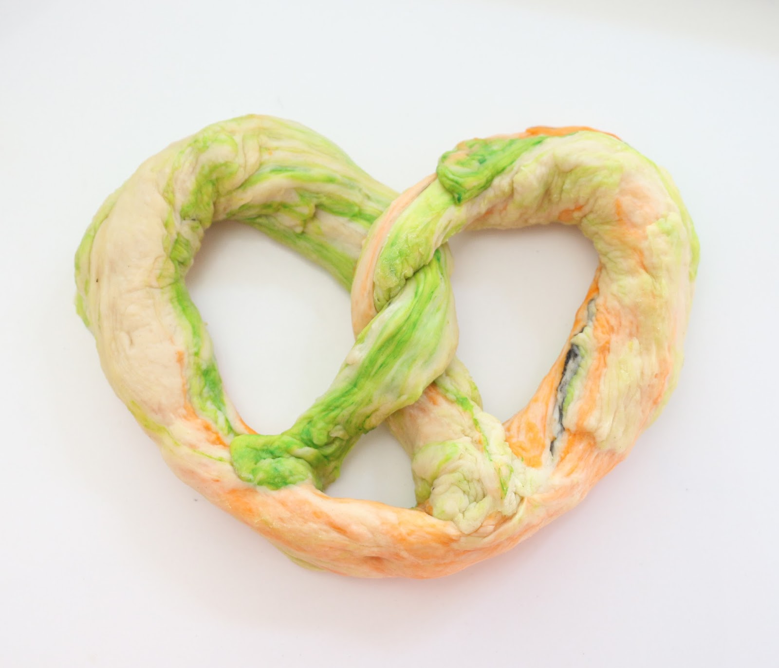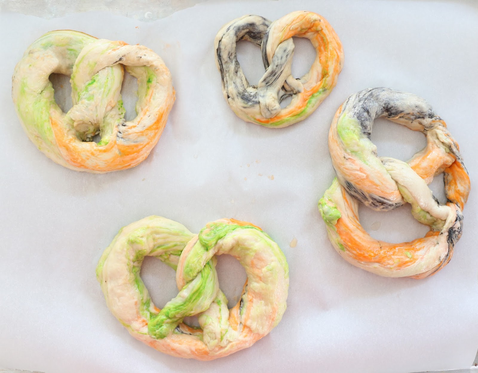 Halloween swirled deliciousness! To make your own you will need to make your pretzel dough base and let it rise once. I use this recipe