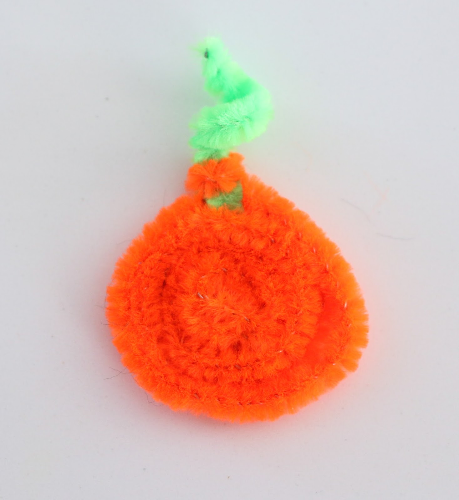 Once you have your base, begin to make the pumpkins. Roll the orange pipe cleaner in on itself to create a circle, then add a 2″ piece of the green pipe cleaner for the pumpkin stem. Repeat this to make two pumpkins.