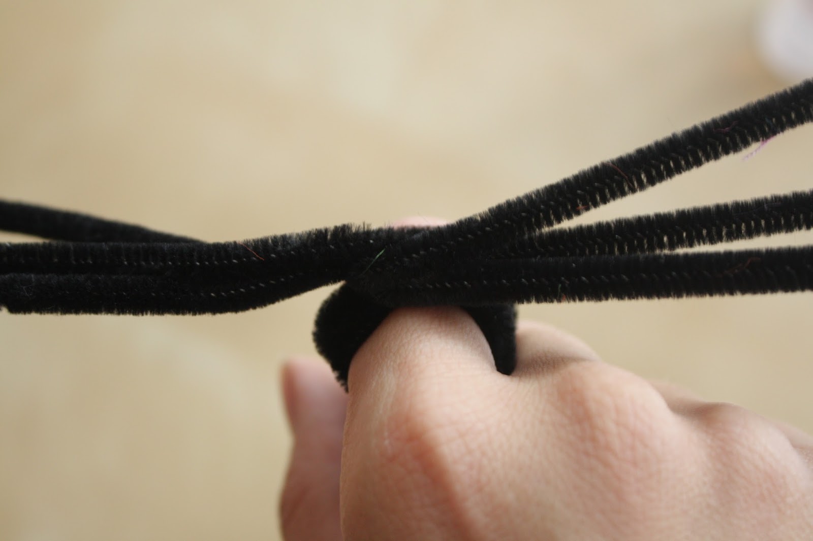 For the spider portion of the headband you will need 4 black pipe cleaners, a black pom pom and some googly eyes. Just follow the pictures to either create a fun spider ring, or you can attach it to the pipe cleaner headband base like I did above.