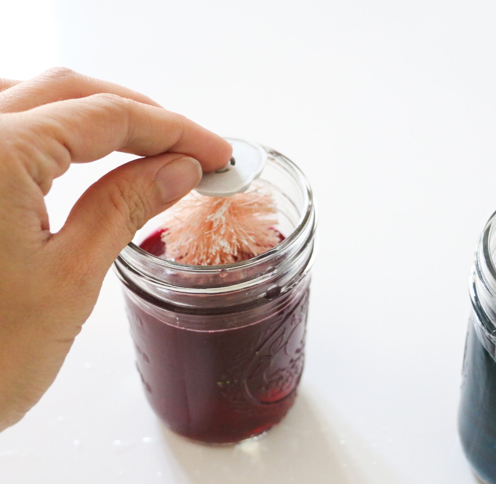 To begin the dyeing process, I added a 1 to 1 ratio of hot tap water to the liquid dye and mixed it to combine. Then I dipped the top 2/3 of the trees in the dye for about 5 seconds. I then moved the tree up so that only 1/3 of the tree (the top portion) was in the dye and kept it there for about 30 seconds. I then removed the trees and dabbed them with paper towels and laid them on fresh paper towels to fully dry. As you can see, I used the light pink tree in the fuchsia dye and the light green tree in the aquamarine dye.