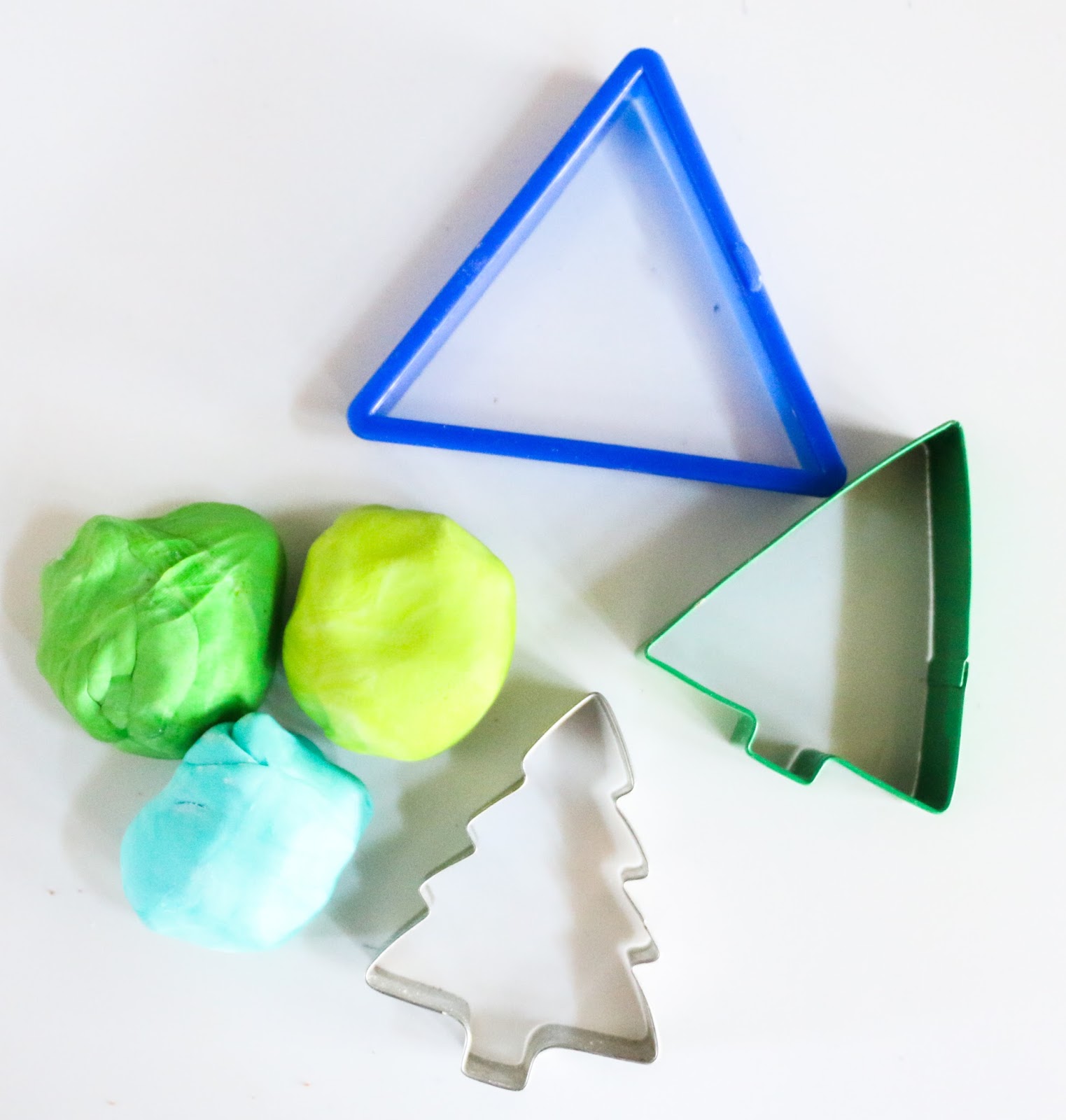 white iced cake (any type of cake and filling will work). You will also need fondant and three shades of green food color (or lime green and teal and  you can mix the two colors to get a third color), and different Christmas tree and triangle cookie cutters.
