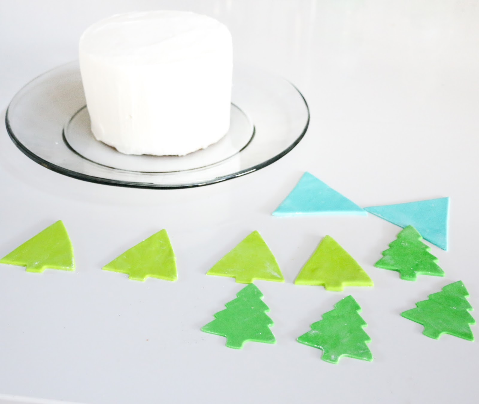 Mix up three small batches of fondant in each of the three colors, roll flat, and cut out in three different tree shapes. Then use extra white icing to adhere your trees around your cake to create your little forest.