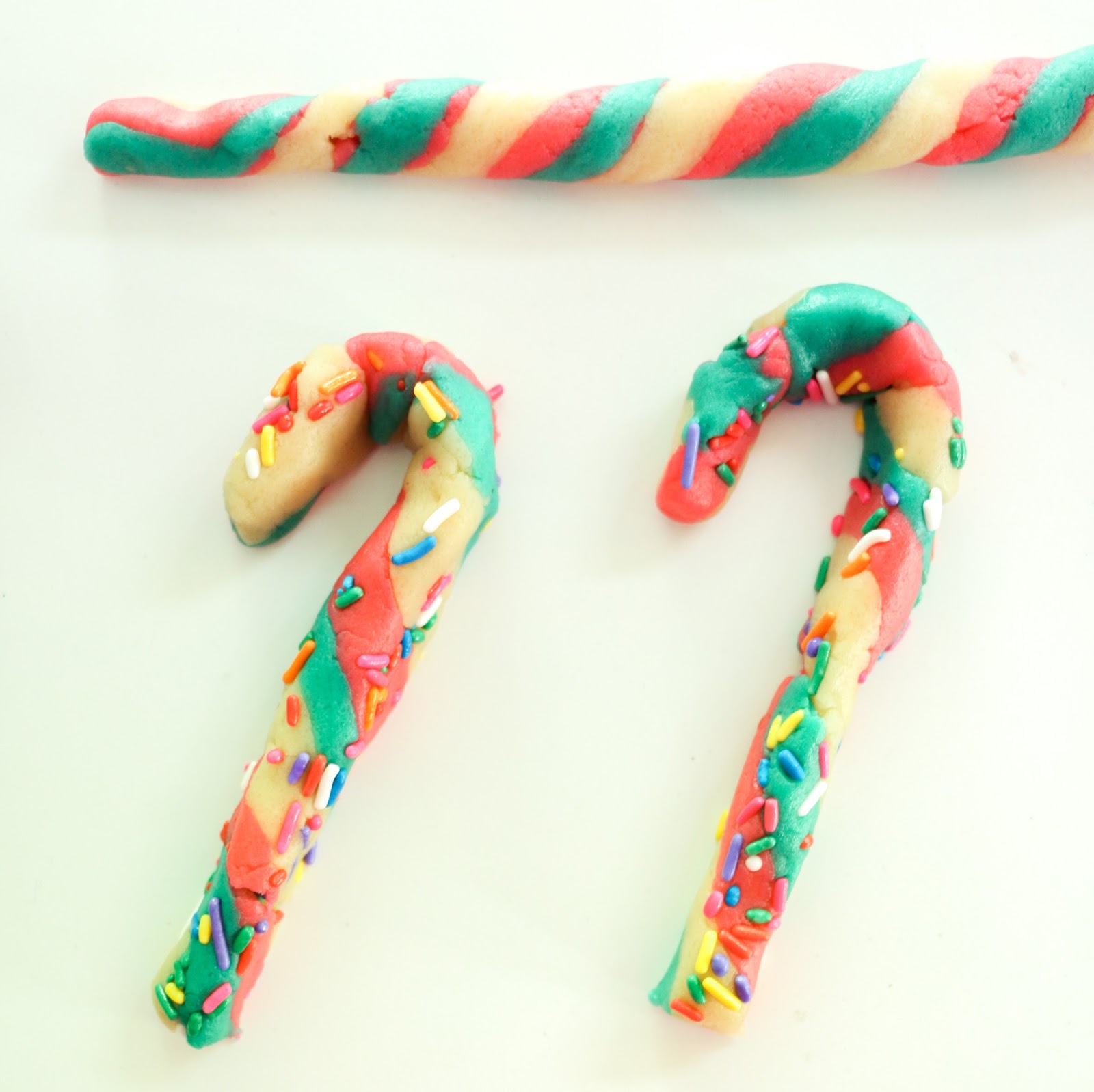 To make these super fun and colorful treats, you will want to make your favorite sugar cookie cutout dough. I used this one. Be sure to add a bit of candy flavoring (such as fruit punch or cherry) to the dough while it is still in the mixer. This step is obviously optional and not necessary. Now divide your dough into 3 pieces and color one of them turquoise and one of them pink. Then roll the dough out into logs, twist together, roll in sprinkles, and form into candy canes.