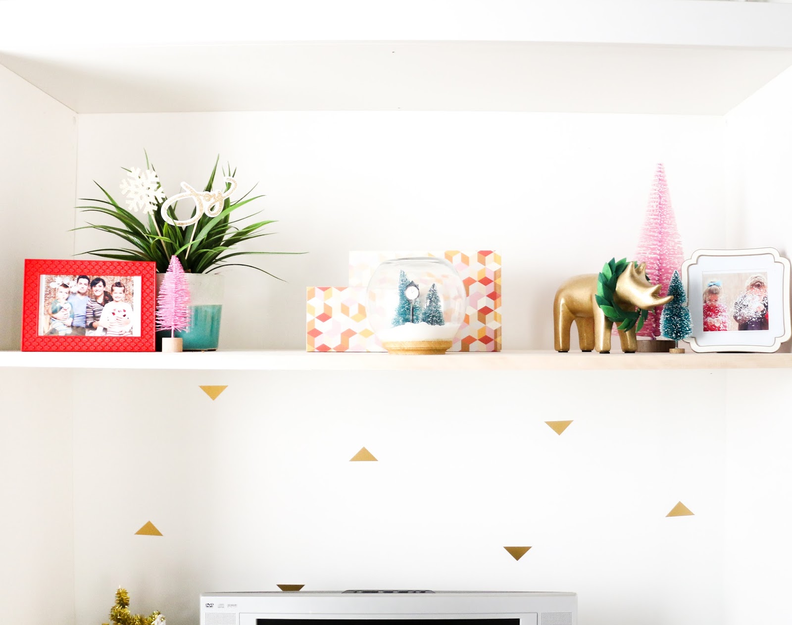 Here we have my ugly old TV… just kidding. But seriously that thing just doesn’t belong, but is oh so functional here. I have another box from Home goods, a few signs from last years Target dollar bin, a few bottle brush trees, family photos from Christmases past, and another snow globe I made.