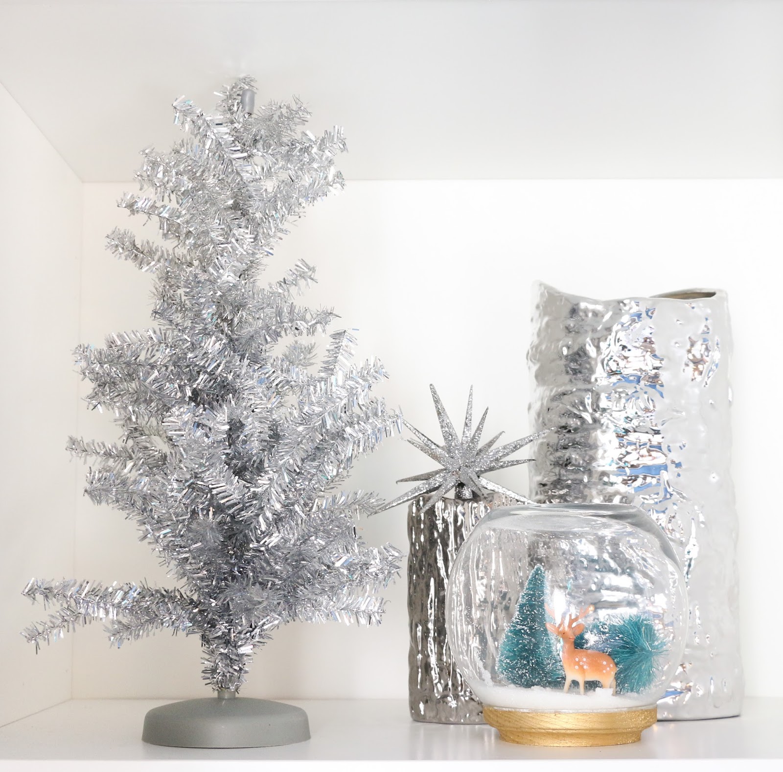 First up the left side where I have shelves filled with small faux Christmas trees in white with marbled salt dough ornaments, several decorative boxes from Home Goods and Target, as well as jars of ornaments, and a DIY snow globe.