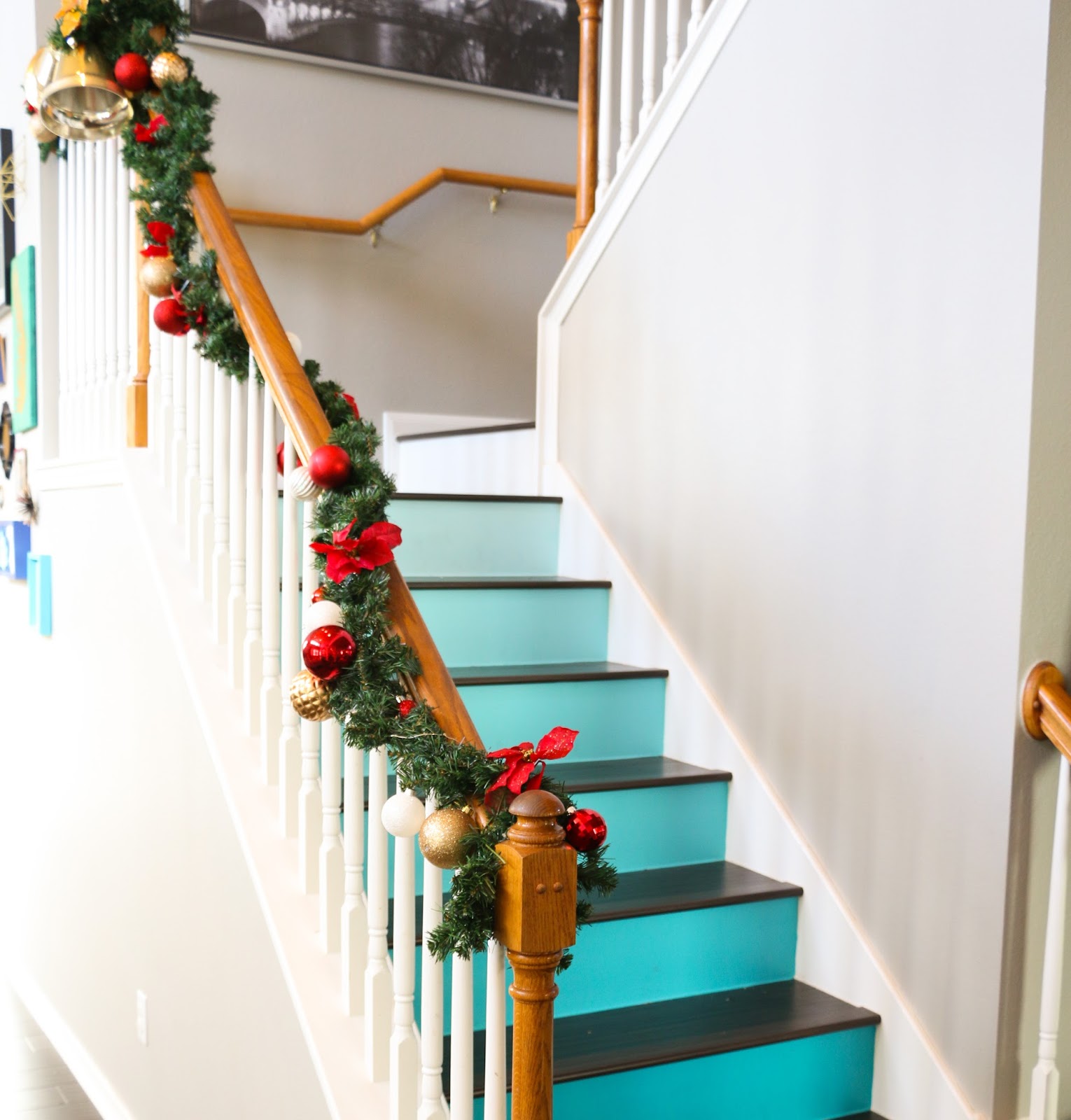 On the other side of the room from the tree and fireplace are my stairs which I decked out with a green garland decorated with faux poinsettia sprigs, and red, white, and gold ornaments. There is also a line of fairy lights in there that can be turned on when guests are over for a little extra shimmer. Although my living room is decorated in traditional Christmas colors, I love the way my blue ombrè stairs look against the red and gold garland.