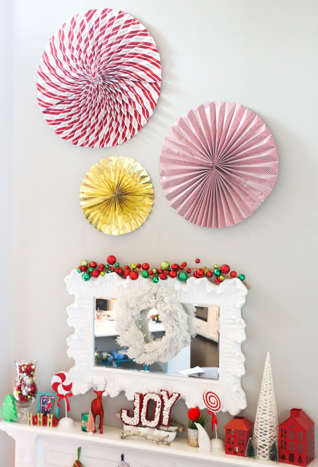 On top of the mantel is a random collection of red and green decor that I pulled from my boxes. I would definitely say that this mantel has no real theme other than color. Above the mantel I hung a white flocked wreath over my mirror and placed a garland of baubles in red and green on top. Then I have my large paper fan decorations I made with wrapping paper.