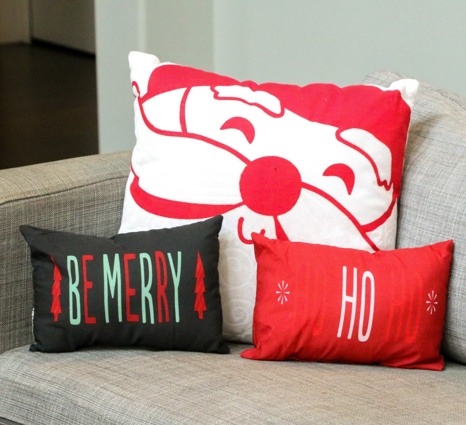 Around my fireplace I have two large floor pillows that I also purchased from Target on clearance last year after the holidays. I added a few ornaments to the fireplace screen to decorate it a bit and love the way it brightens up that spot. As for the stockings, my mother-in-law made the two middle ones from felt stocking kits for this kids, and the hubs and I are stuck with plain store bought ones from 5 or 6 years ago!