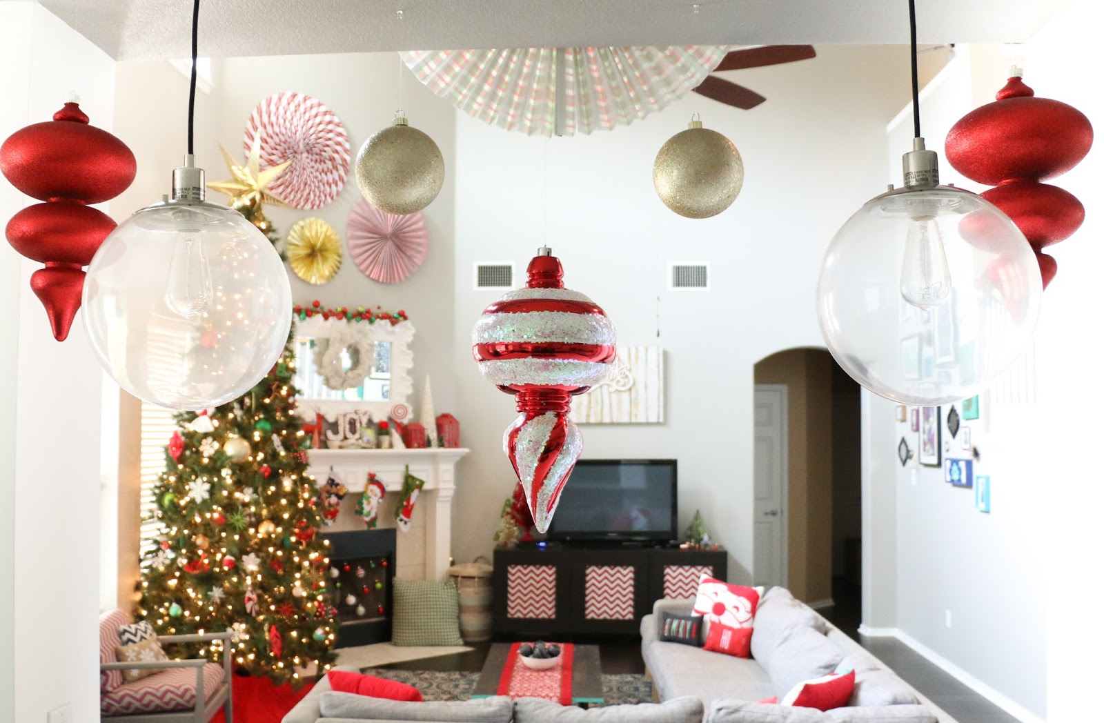 Remember when I said that I liked large scale decorations? Yeah, these large ornaments are some of the things that I have collected over the years for my decor. Last year I had these (plus a few more) hanging from our 18′ ceiling over the mantel. This year since I covered that area with paper fans, I decided to hang these over the kitchen island around my glass pendant lights. It is really pretty to look out into the living room from the kitchen and see these, the large tree, and fireplace all in one view.
