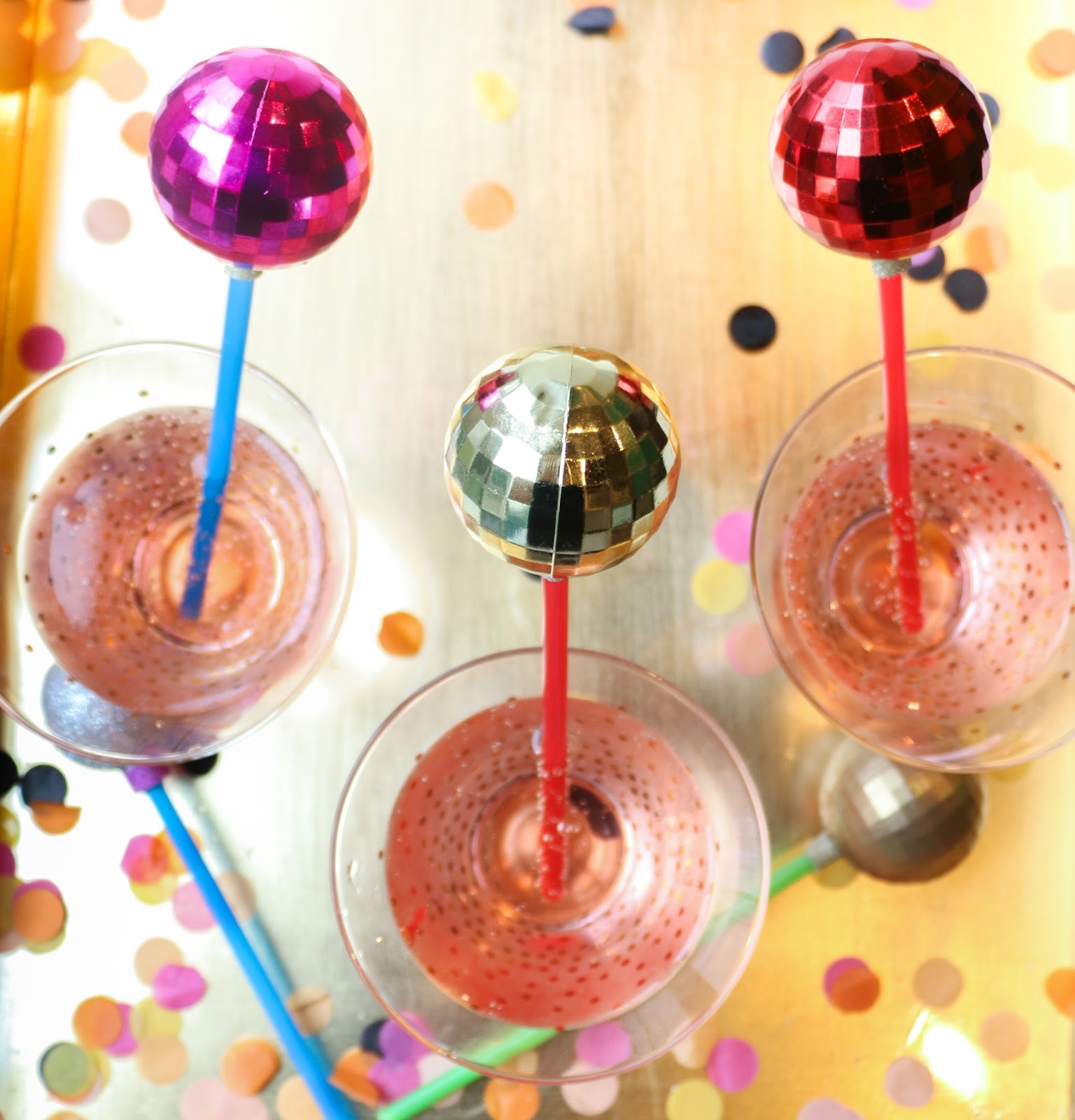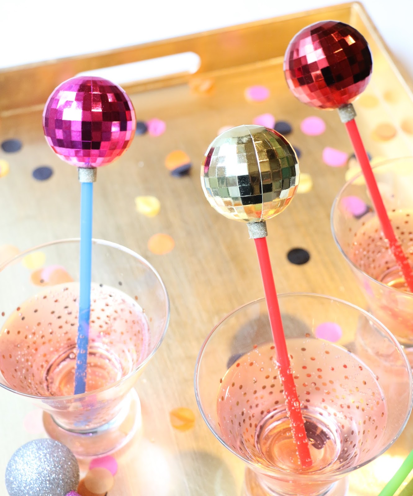 Now that Christmas is over, it is time to craft a little fun for New Years Eve. To me New Years Eve is all about celebration, the notorious Times Square ball drop, and a fancy cocktail or glass of champagne. And what glass doesn’t look better than with a fancy sizzle stick adorning it? Using a few mini ornaments I pilfered from my Christmas stash as I packed up the decor and a few colorful straws, I was able to whip up a few glam disco ball drop swizzle sticks to help ring in the new year.