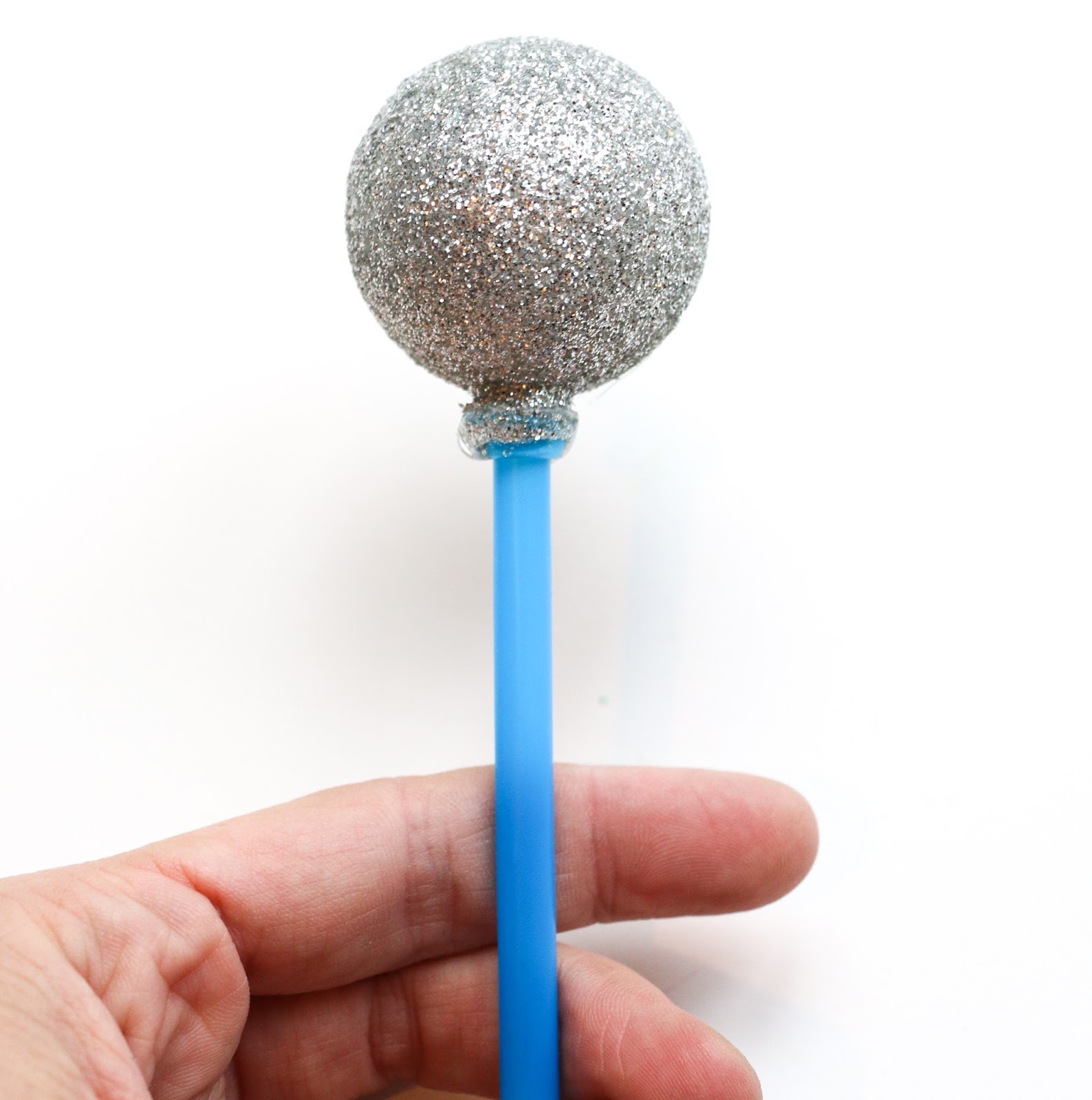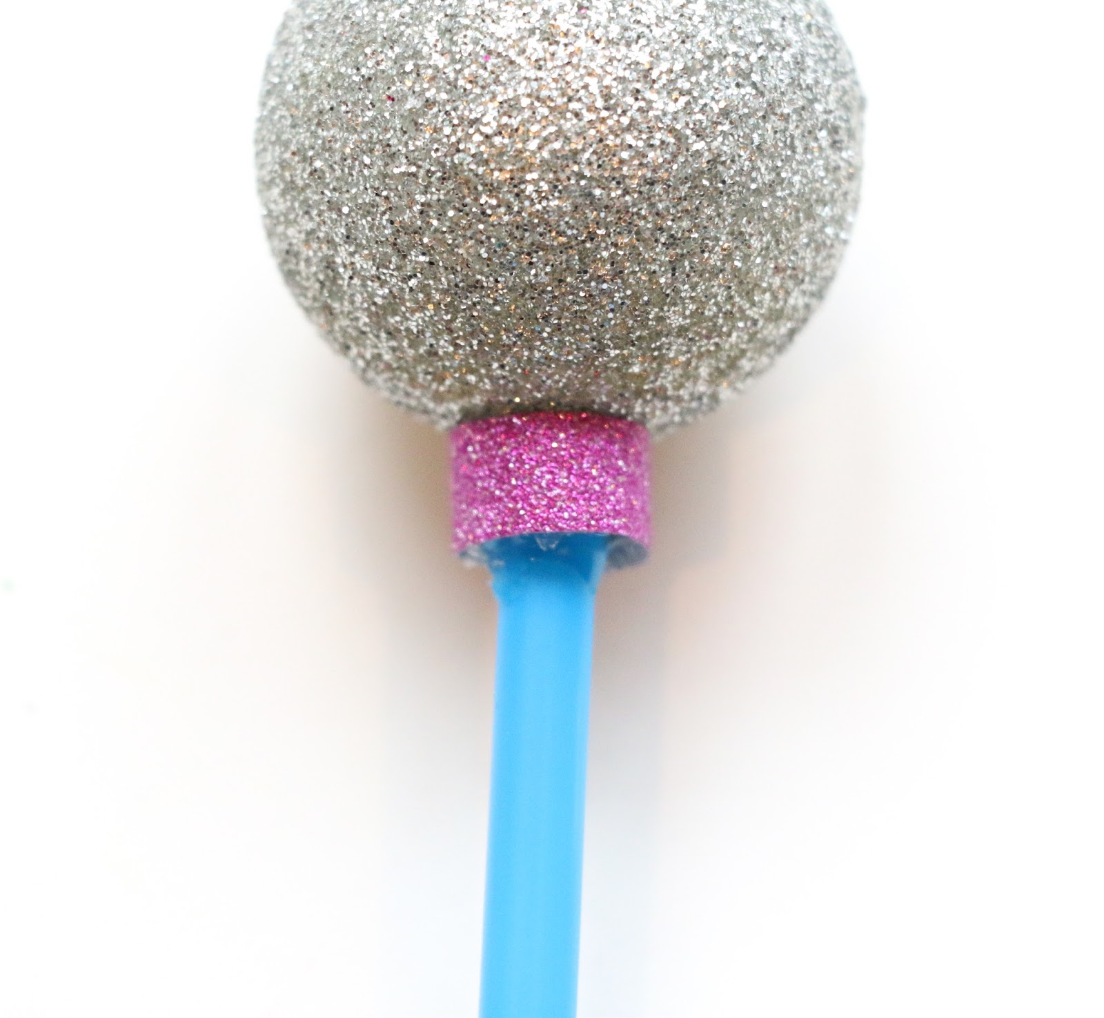 Begin by pulling off the ornaments cap. Then you will hot glue the ornament to one end of the straw. After the glue is dry, use a bit more glue to affix the washi tape around the base of the ornament where it is glued to the straw.