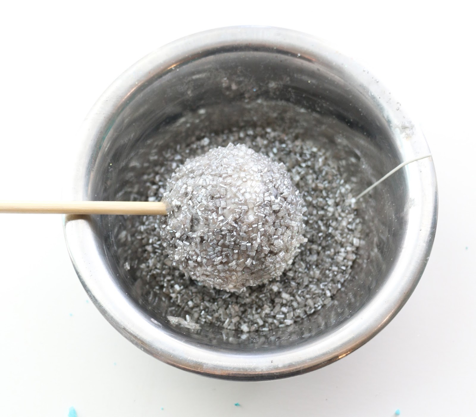 For the last step you will dip the chocolate ball pop in the royal icing just enough to coat the ball, then roll the pop in the silver sprinkles and let dry.