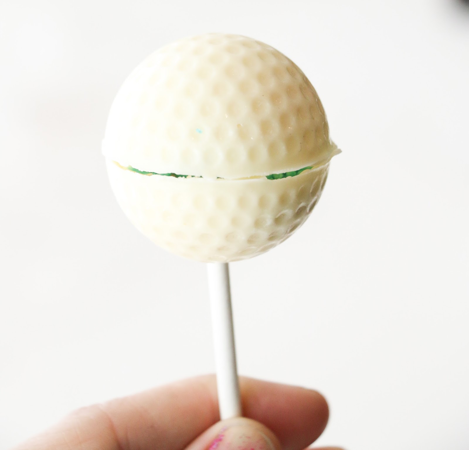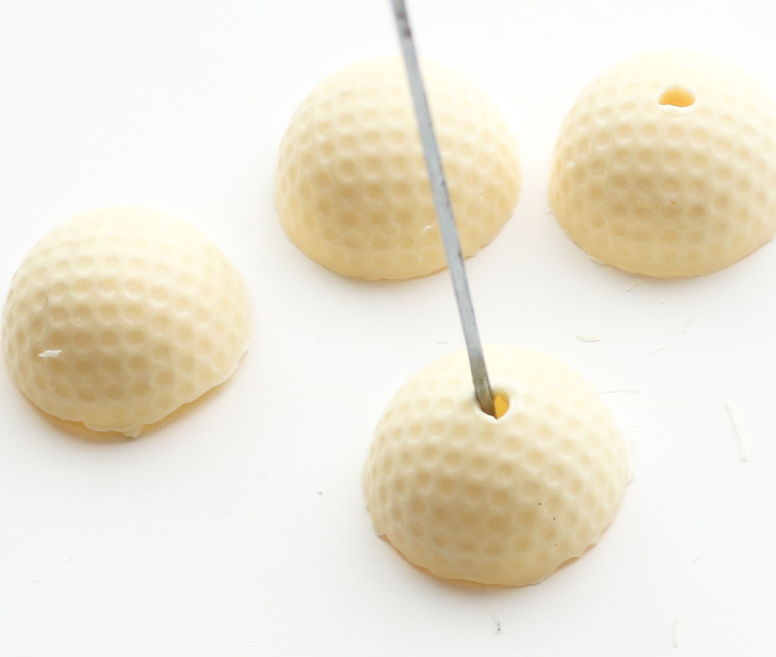 Now you will need to create the hole in half of the ball shapes for the stick. To do this, heat up the end of a metal skewer (I used a kebab skewer) and gently press it into the chocolate. This will melt the chocolate enough to create a hole. Insert your stick and use a little more coating chocolate on the inside of the ball to hold the stick in place.