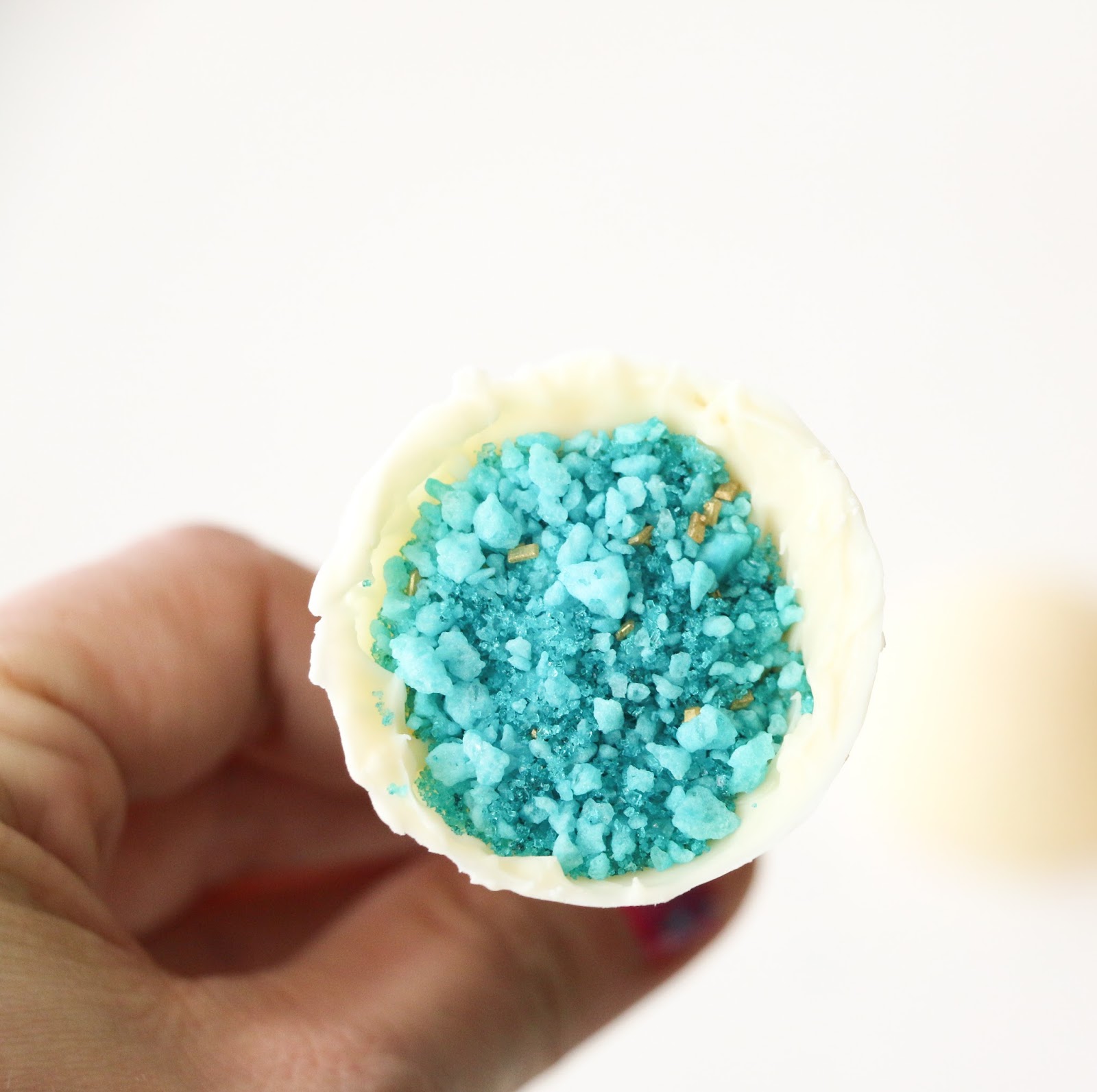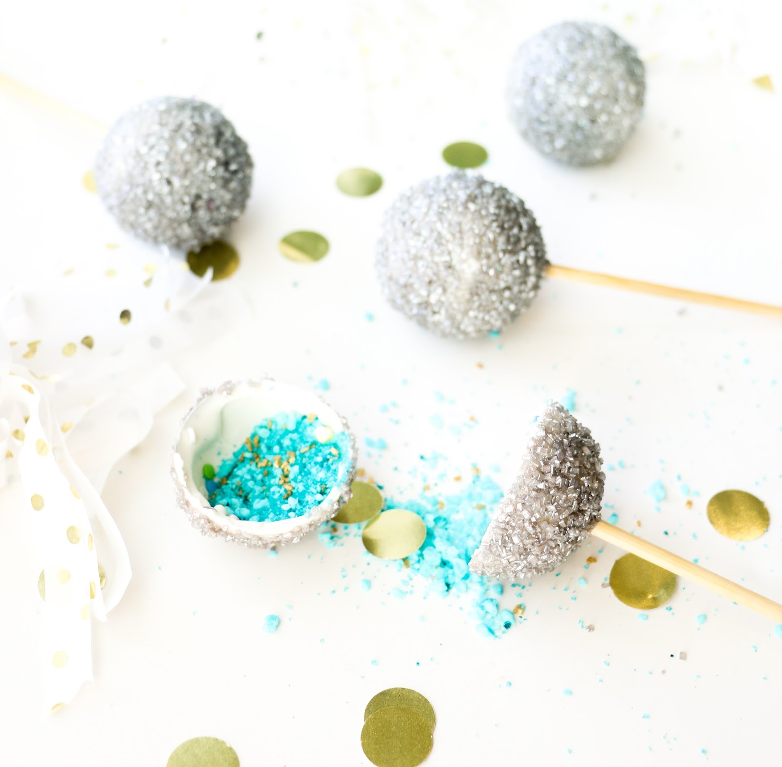 These silver disco ball pops are made with coating chocolate, filled with pop rocks and sprinkles, and then coated in silver sugars. One bite into them reveals the pop rocks center that gives you a little explosion of fireworks in your mouth! How fun! And surprisingly they are fairly simple and don’t require any baking skills.