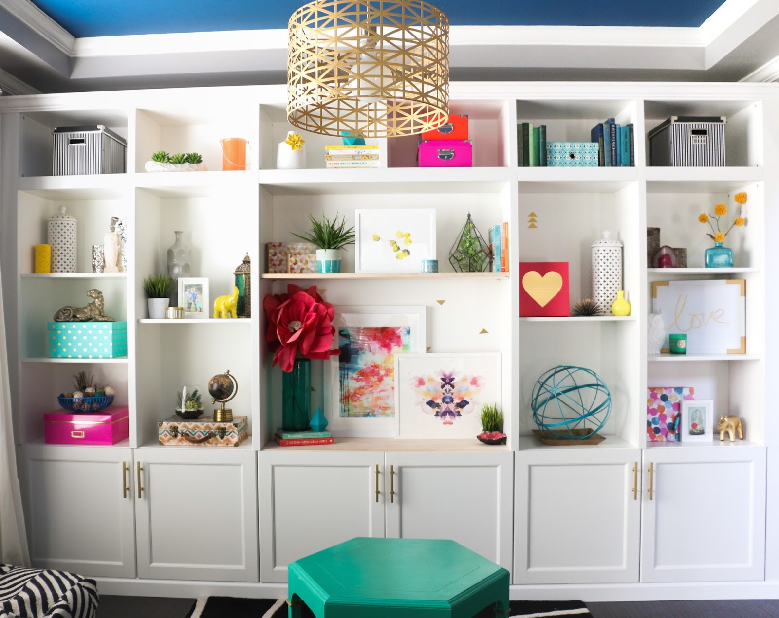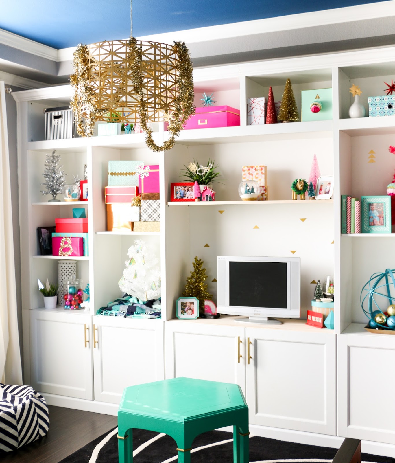 First up is my favorite home reno project, and that happens to be my built-ins in my formal living room. I knew I wanted to put built-in shelving in this space from the moment we put an offer in on our house, and in January of this year we finally had a plan and time to complete them. I love this space so much and it turned out even better than I could have hoped. I love having the space to arrange and display all my little home decor goodies and it is even better to have a space to decorate for every season and holiday. I love my shelves! Below you can see them all decked out for Christmas, Halloween, everyday, and for summer with colorful artwork. Next up Valentine’s Day!